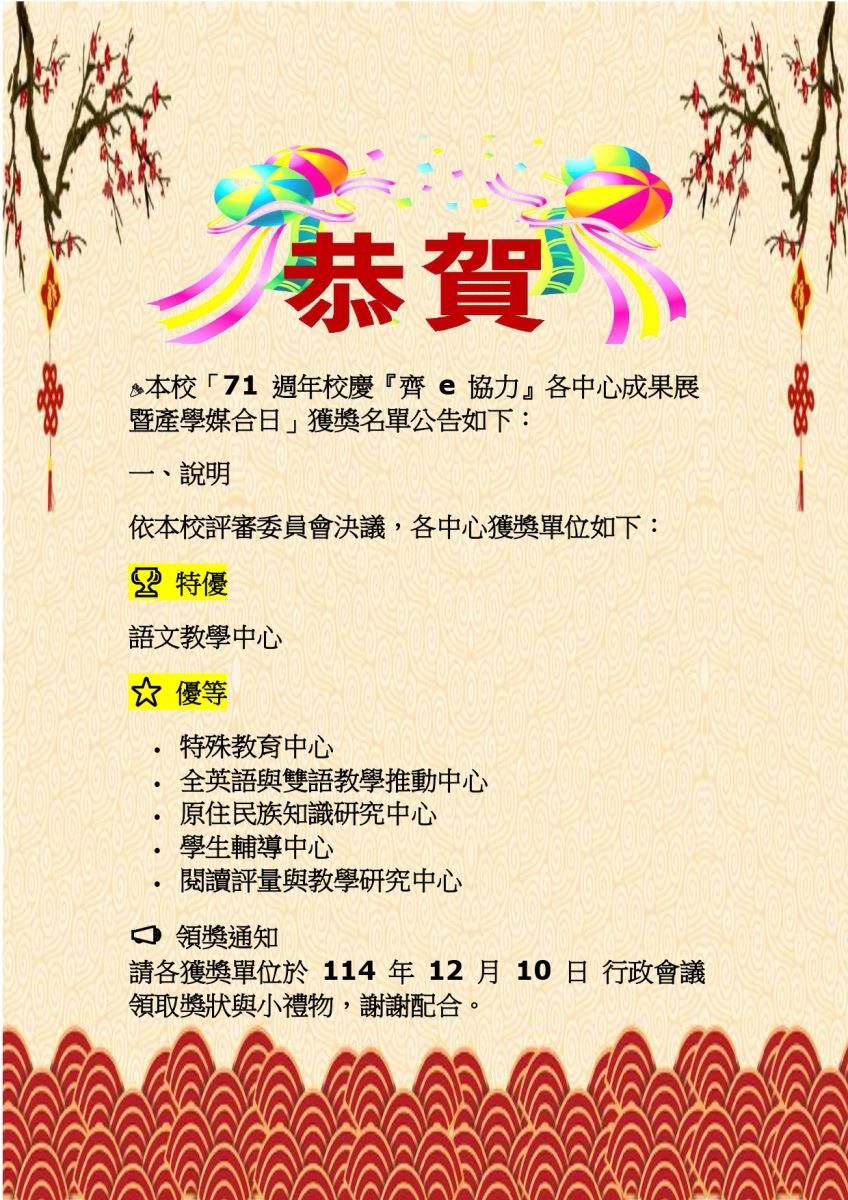 賀!本中心獲「71 週年校慶『齊 e 協力』各中心成果展暨產學媒合日」優等