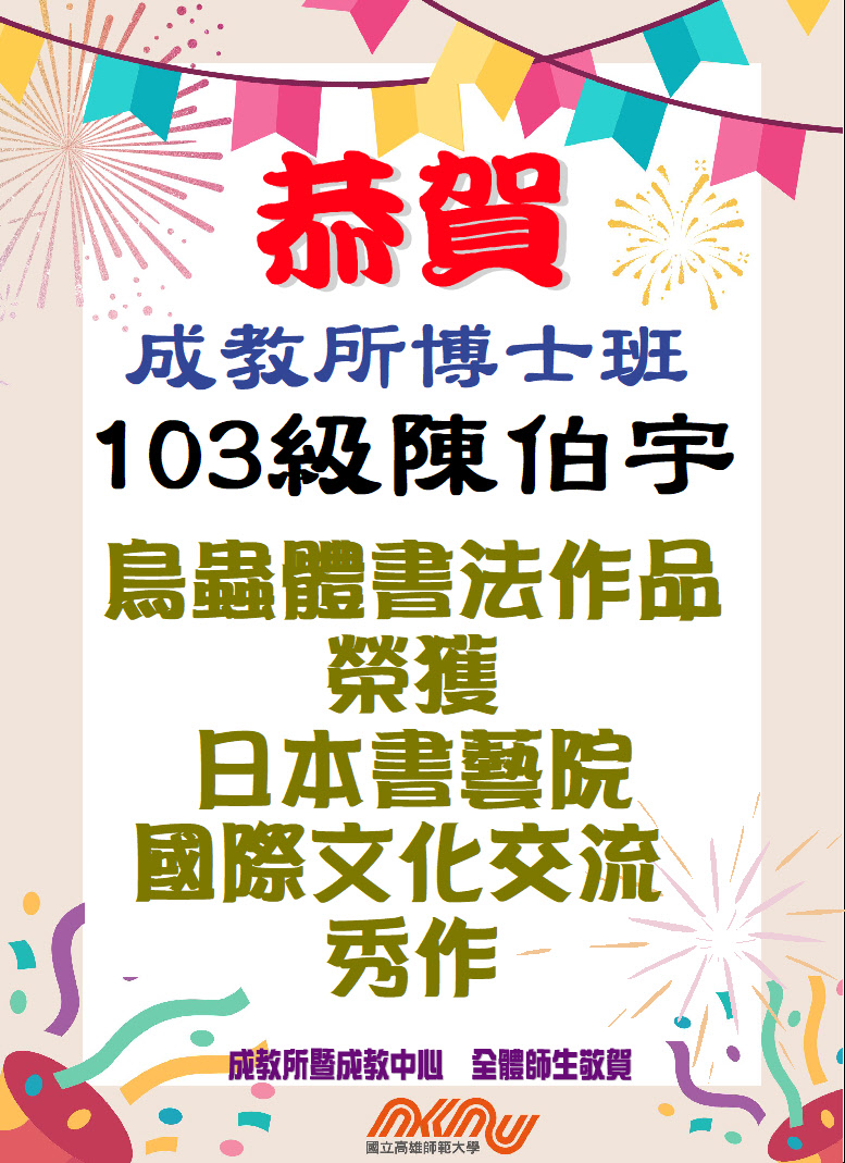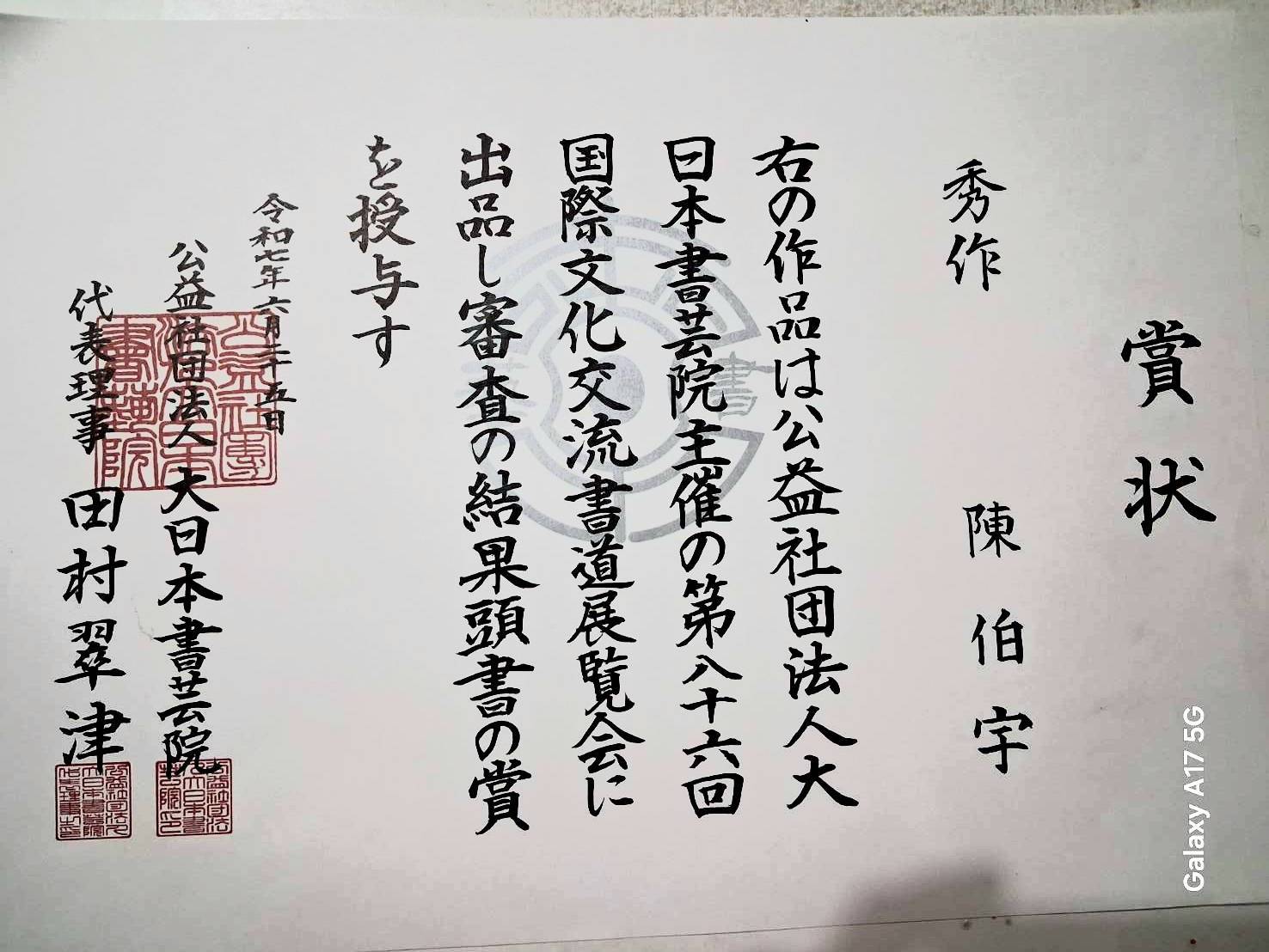 成教所博士班103級陳伯宇鳥蟲體書法作品榮獲日本書藝院國際文化交流《秀作賞狀》
