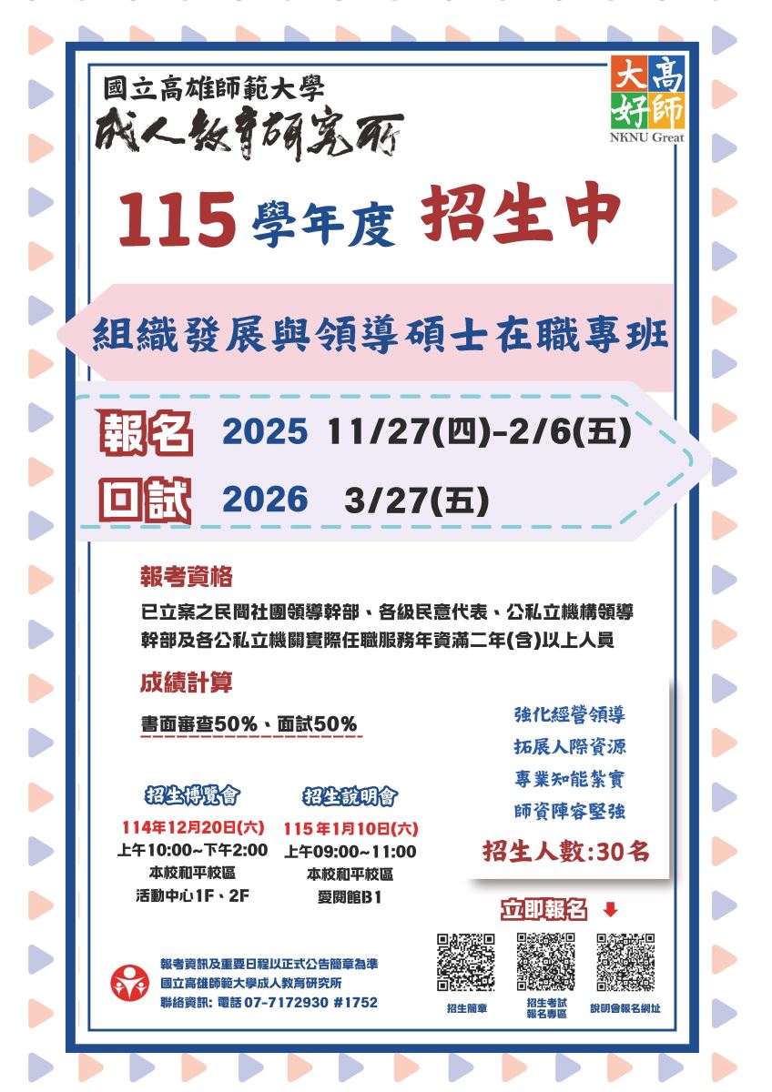 招生說明會:115年1月10日(六)上午9:00-11:00 本校和平校區愛閱館B1