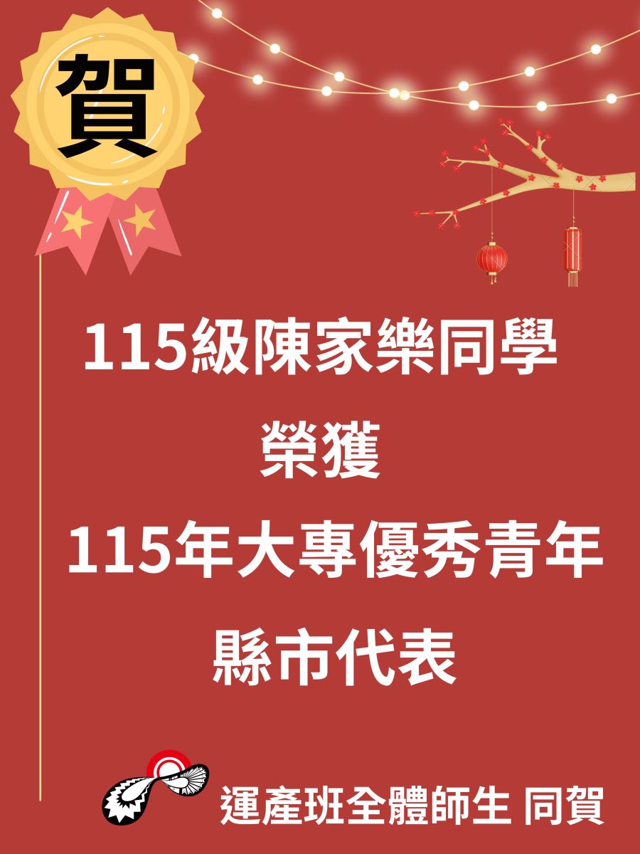 本專班陳家樂同學榮獲115年大專優秀青年-縣市代表
