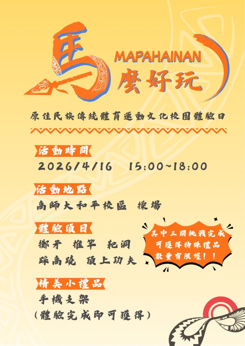 【MAPAHAINAN馬麼好玩 - 原住民族傳統體育運動文化校園體驗活動】 本專班於 115 年 4 月 16 日 (四) 下午 3:00 ~ 6:00 📣📣📣 辦理114學年度原住民族傳統體育運動文化校園體驗活動 活動當日將有『傳統推竿🏋️♂️』、『頂上功夫🥏』、『傳統擲矛🎯』、 『靶洞🪃』、『踩高蹺🪜』多項活動體驗 ♨️活動重頭戲♨️《 布農族烤全豬 》、《 活動紀念品》👏👏👏 🎉🎉🎉歡迎大家一同共襄盛舉🎉🎉🎉 ☀️ 豔陽高照專班熱情依舊不滅,你怎能不來體驗 💯💯💯