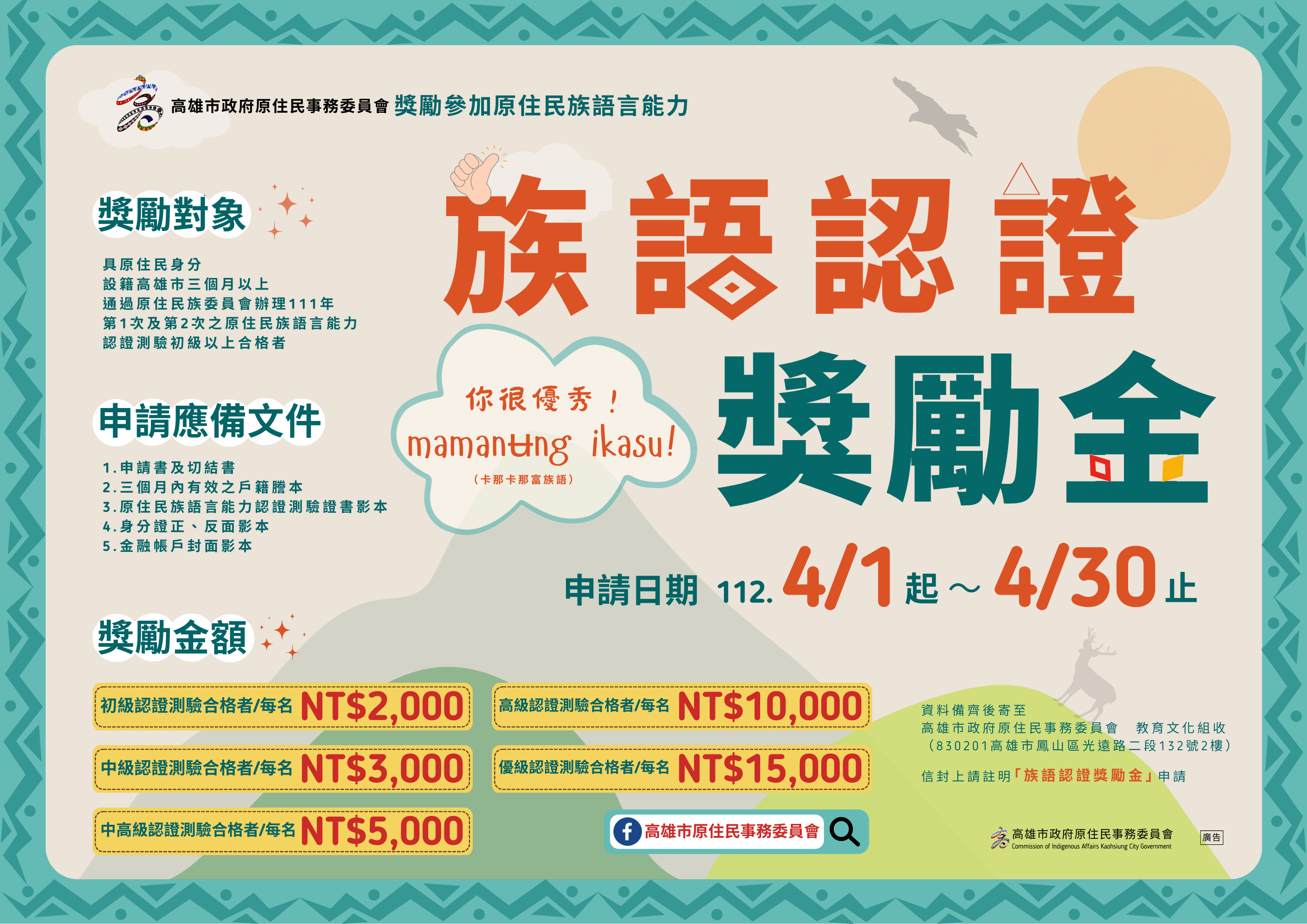 信封上請註明「族語認證獎勵金」申請