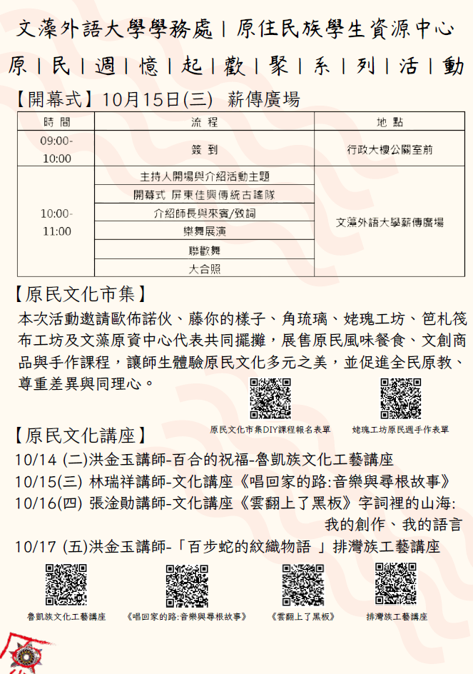 文藻學校財團法人文藻外語大學原住民族學生資源中心辦理「原民週」系列活動,惠請本校協助公告。
