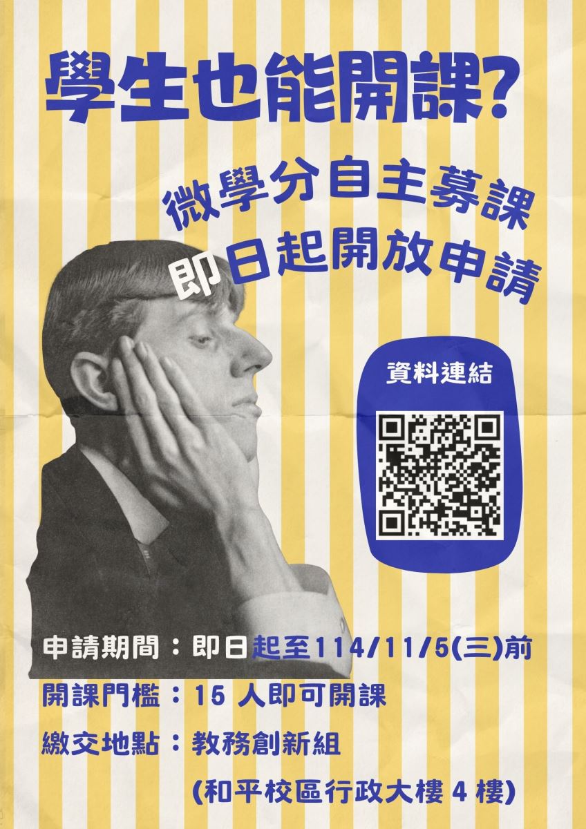 📅 申請期間:即日起至114/11/5(三)前 📍 繳交地點:教務創新組(和平校區行政大樓4樓) 👥 開課門檻:15 人即可開課 🔗 資料下載:點我下載