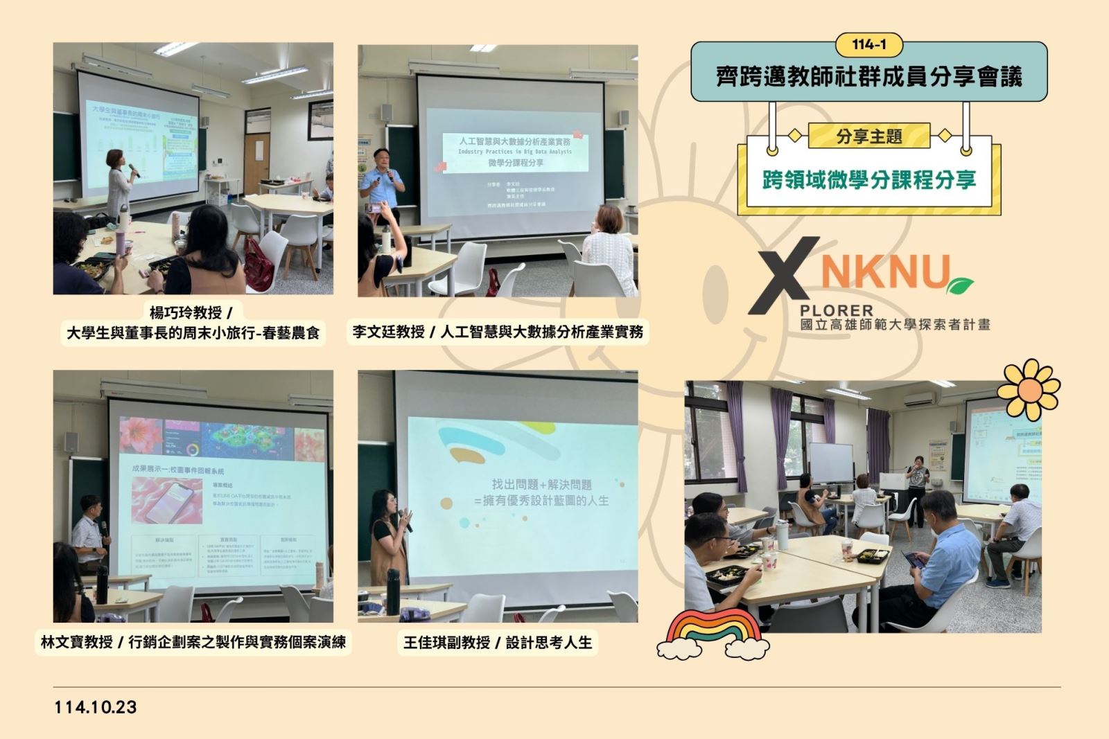 XPlorer齊跨邁x好AI高師大教師社群於114年10月23日(星期四)於本校和平校區舉辦社群成員分享會議,主題聚焦於「跨領域微學分課程分享」。本次會議由科環所黃琴扉所長主持,計有16位社群成員及教師參與,並邀請楊巧玲教授、李文廷教授、林文寶教授與王佳琪副教授分享其課程設計理念、教學實務與學生回饋,期能透過經驗交流深化未來課程規劃與跨域合作可能。