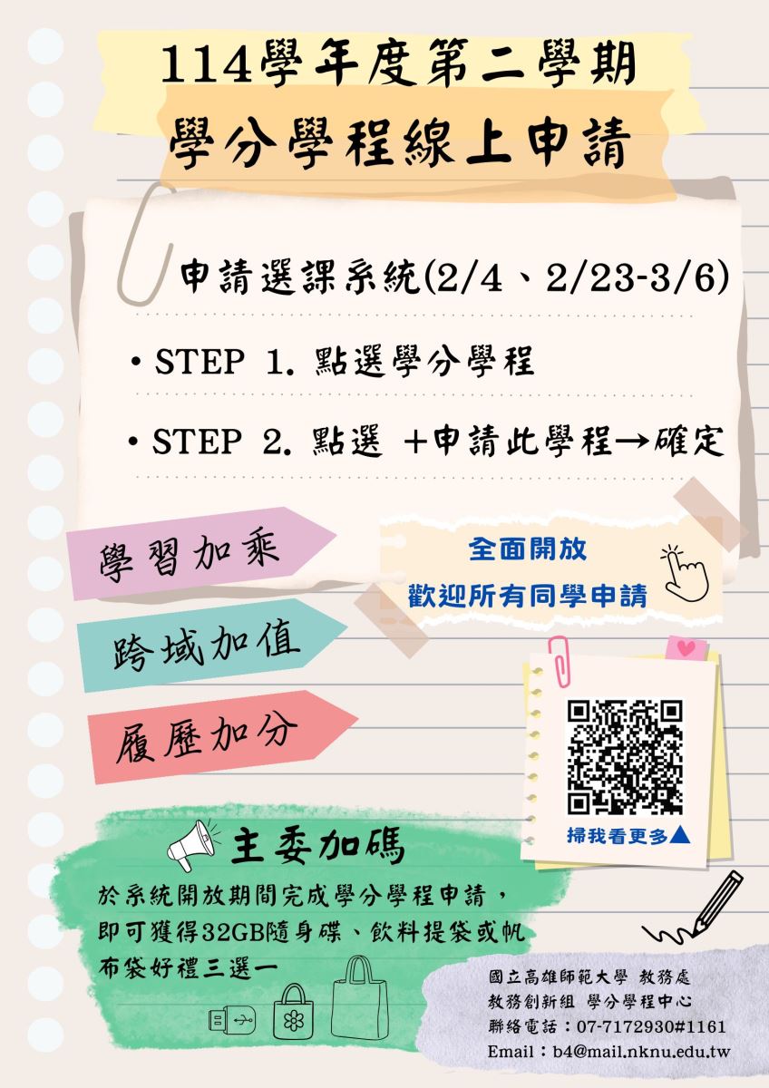 一、申請時間:選課第三階段(115年2月4日)及加退選期間(2月23日至3月6日)。