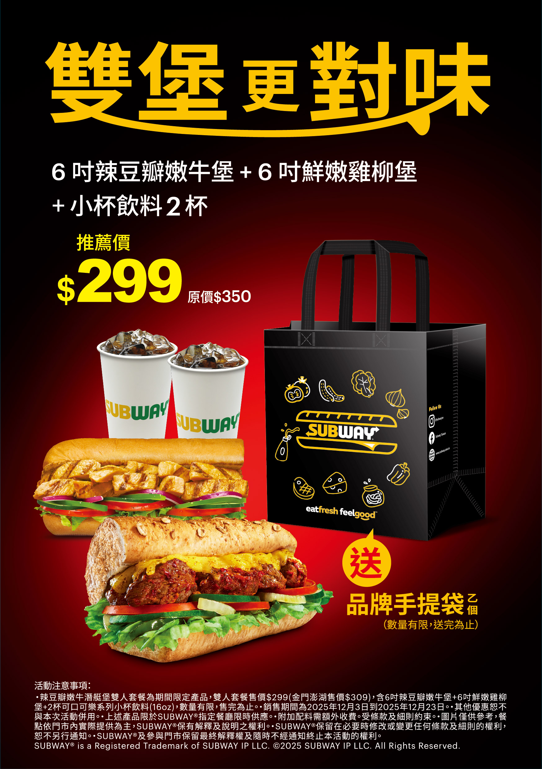 套餐內容 : 辣豆瓣嫩牛6吋潛艇堡 + 鮮嫩雞柳6吋潛艇堡