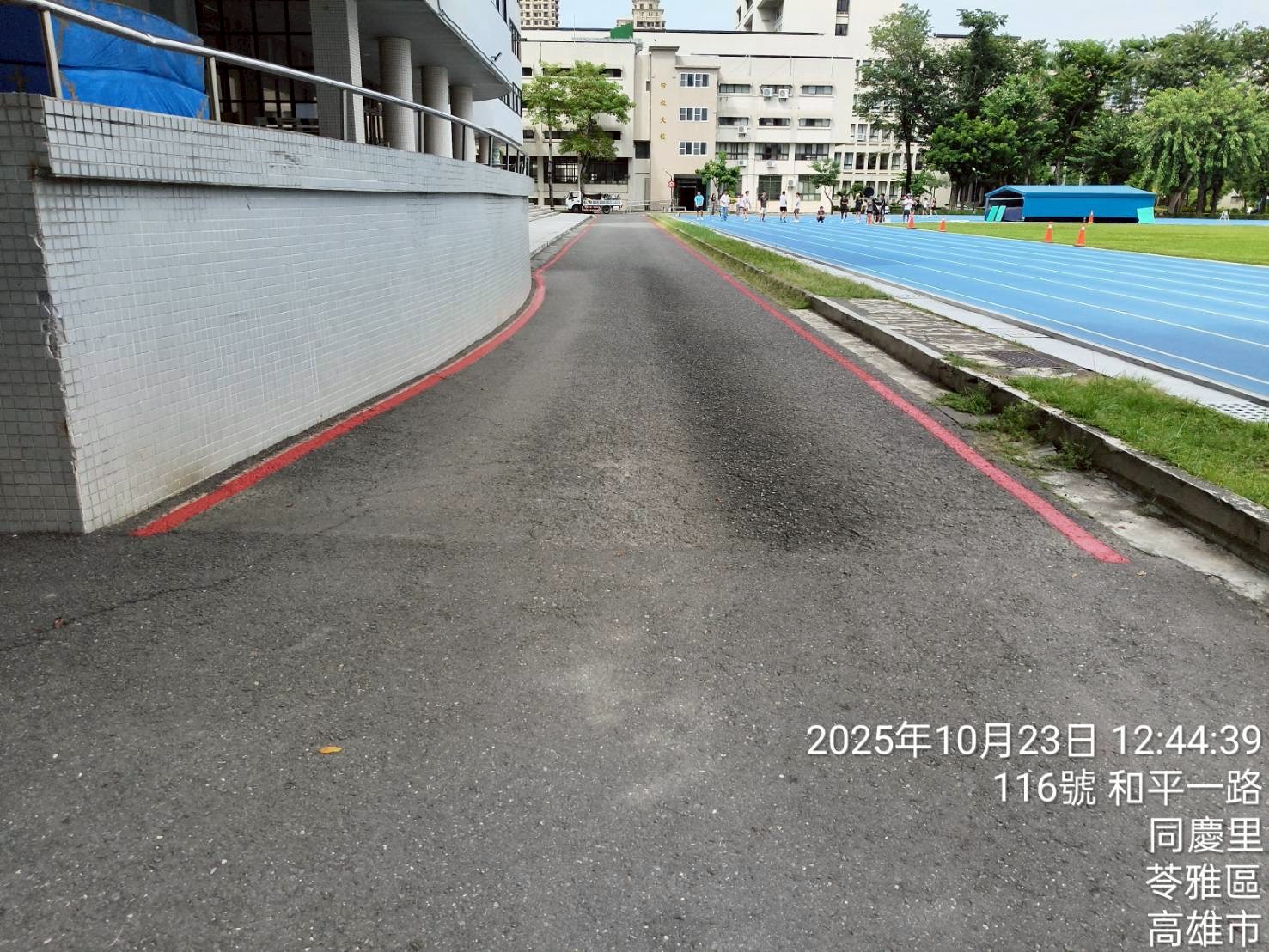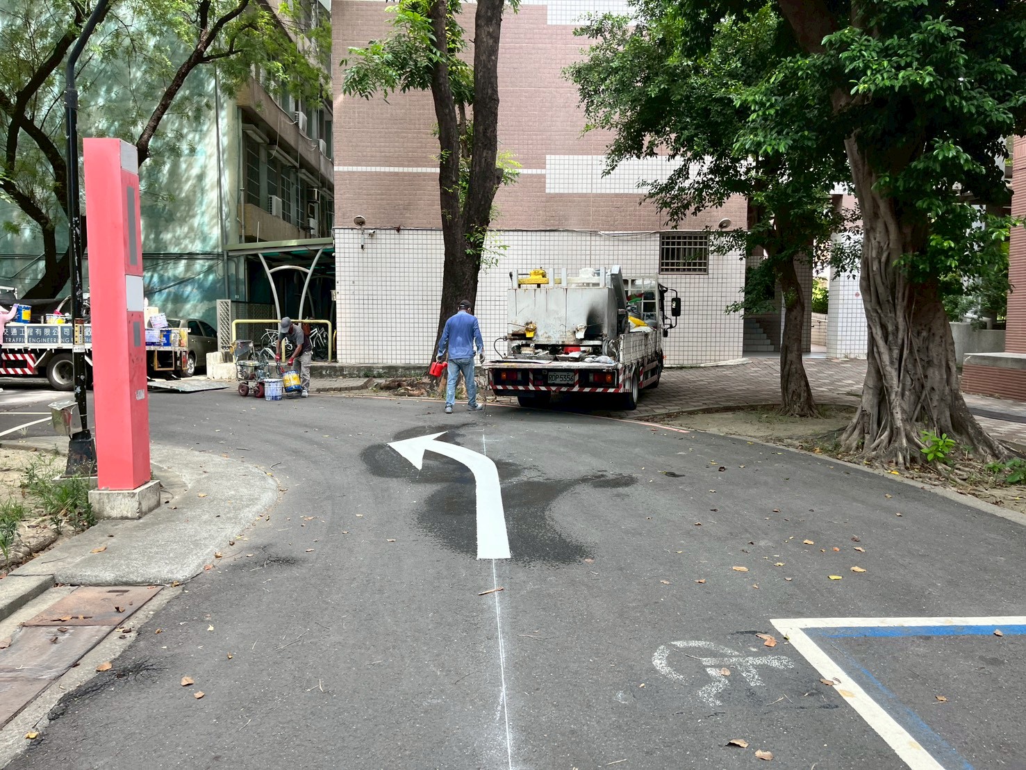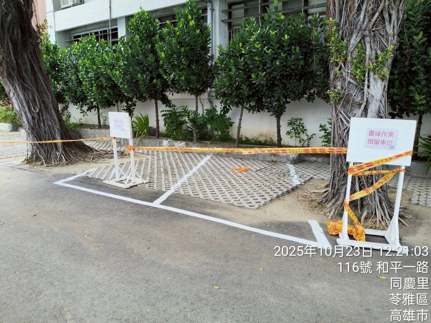 敬請所有駕駛車輛及行人,務必依循標線指示通行,並減速慢行,