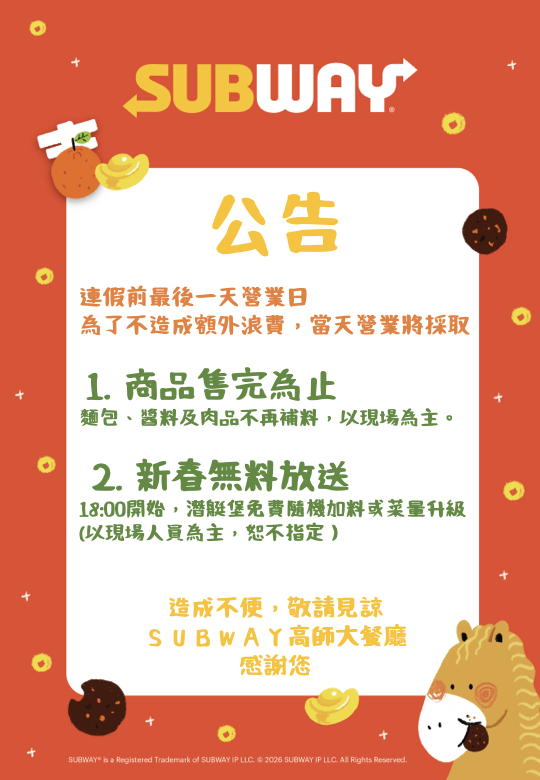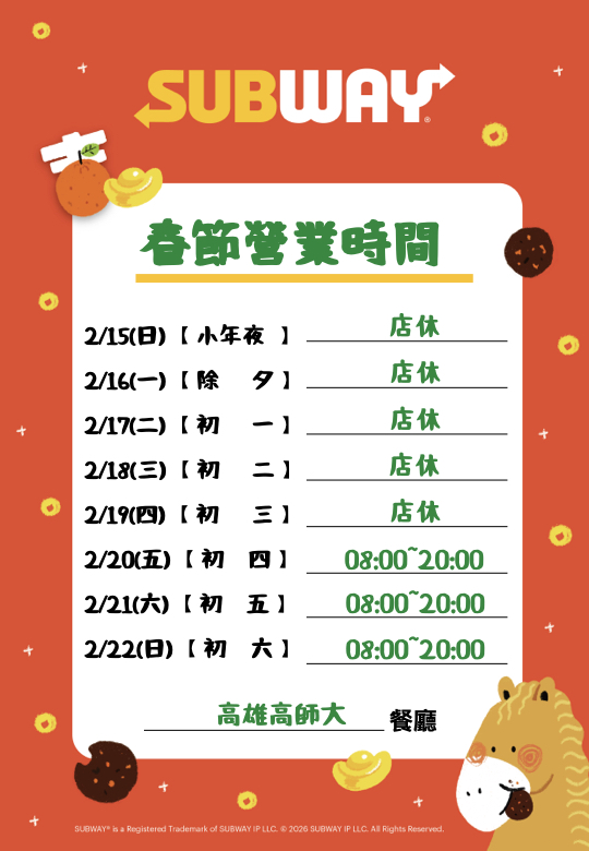 Subway高師大餐廳🧧【春節營業時間調整 × 新春無料放送】🧨