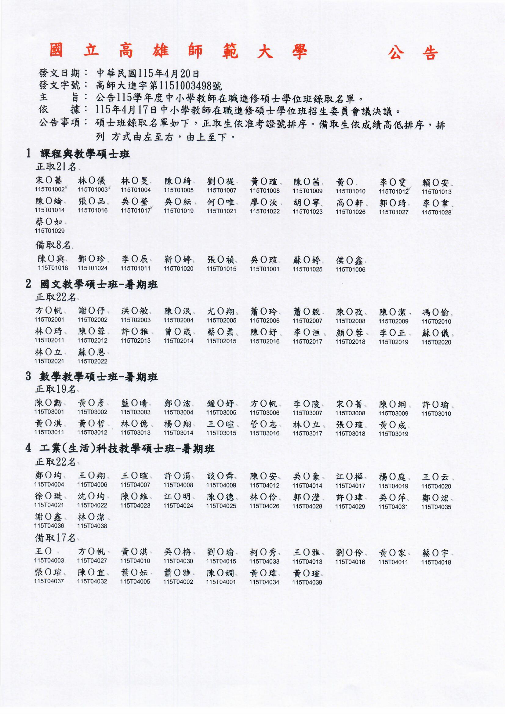 公告115學年度中小學教師在職進修碩士學位班錄取名單