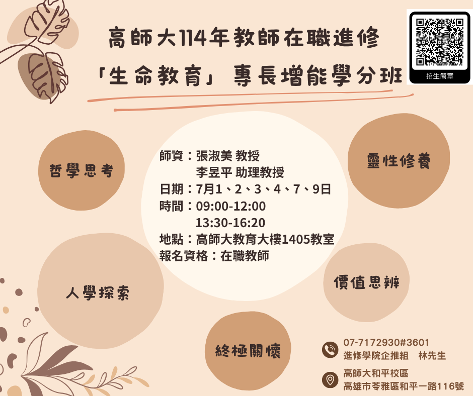 進修學院位置:(和平校區)高雄市和平一路116號 教育大樓1樓 教 務 組:(07)717-2930 分機:3643-3647 企劃推廣組:(07)717-2930 分機:3601、3661-3665、3667 傳真: (07)711-0686 綜合服務組:(07)717-2930 分機:3622-3623 學習諮詢組:(07)717-2930 分機:3623 傳真:(07)725-5824