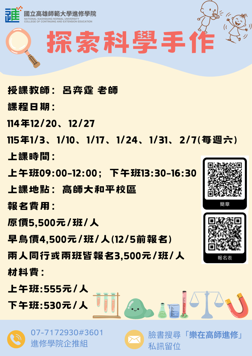 進修學院位置:(和平校區)高雄市和平一路116號 教育大樓1樓 教 務 組:(07)717-2930 分機:3643-3647 企劃推廣組:(07)717-2930 分機:3601、3661-3665、3667 傳真: (07)711-0686 綜合服務組:(07)717-2930 分機:3622-3623 學習諮詢組:(07)717-2930 分機:3623 傳真:(07)725-5824