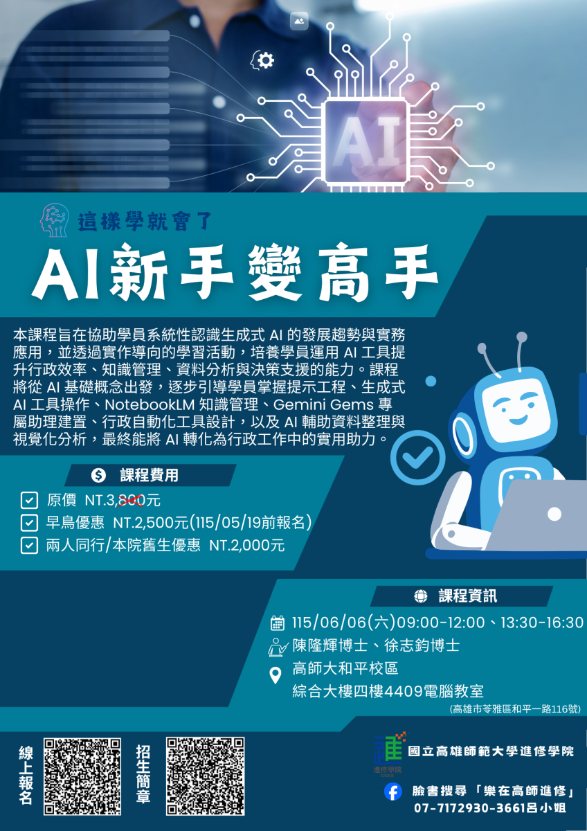 進修學院位置:(和平校區)高雄市和平一路116號 教育大樓1樓 教 務 組:(07)717-2930 分機:3643-3647 企劃推廣組:(07)717-2930 分機:3601、3661-3665、3667 傳真: (07)711-0686 綜合服務組:(07)717-2930 分機:3622-3623 學習諮詢組:(07)717-2930 分機:3623 傳真:(07)725-5824