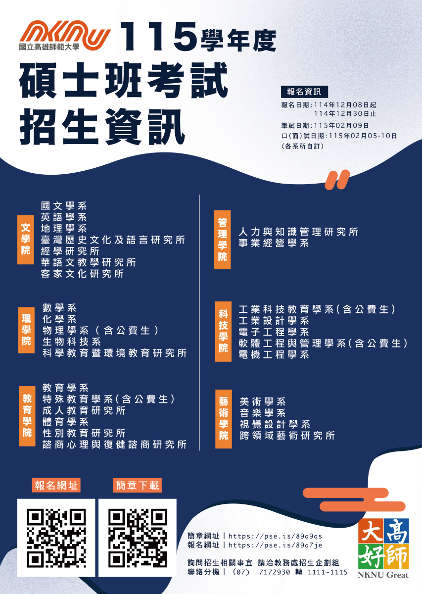 115學年度碩士班入學考試招生簡章公告,報名自12月08日至12月30日截止,歡迎報考。