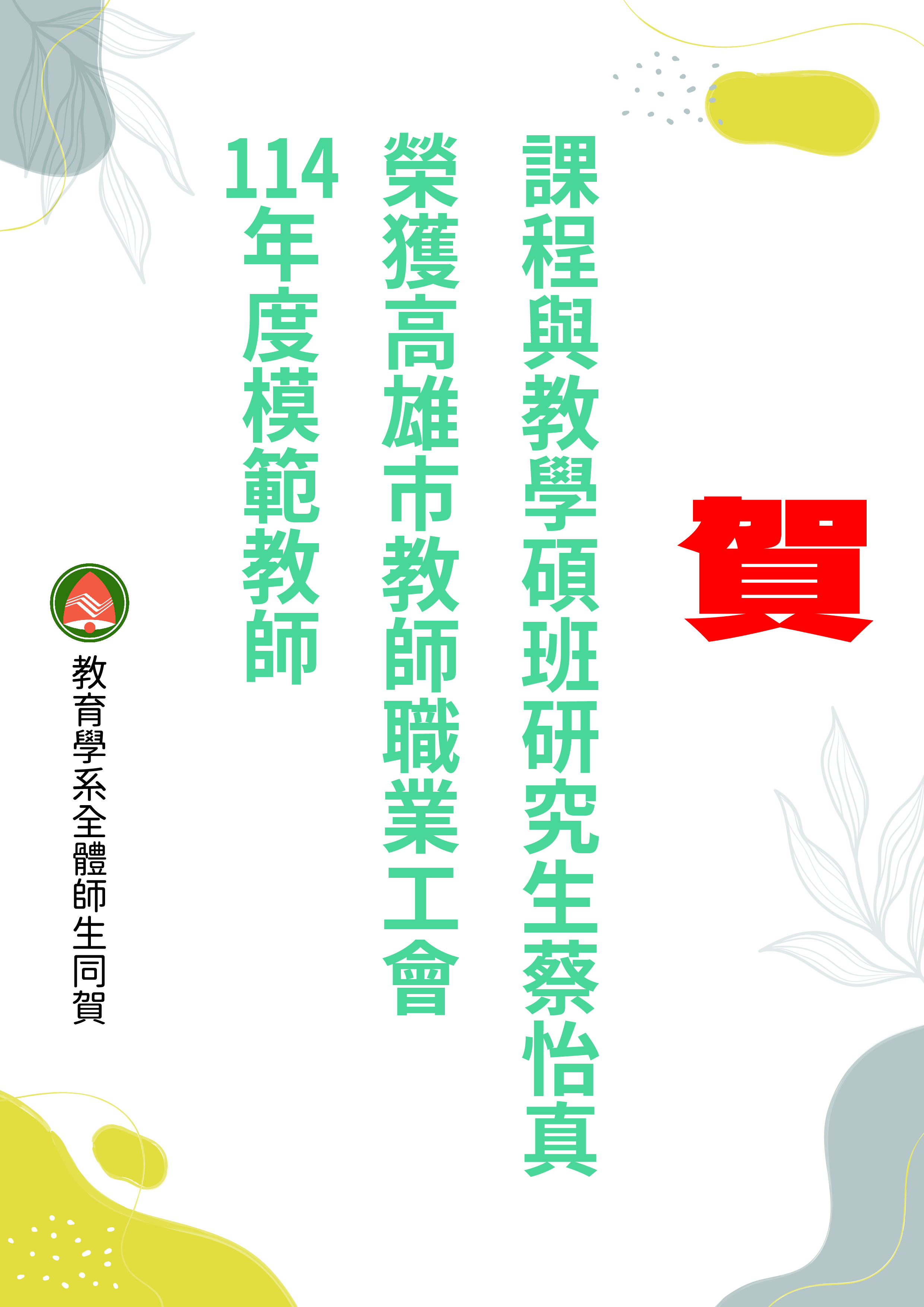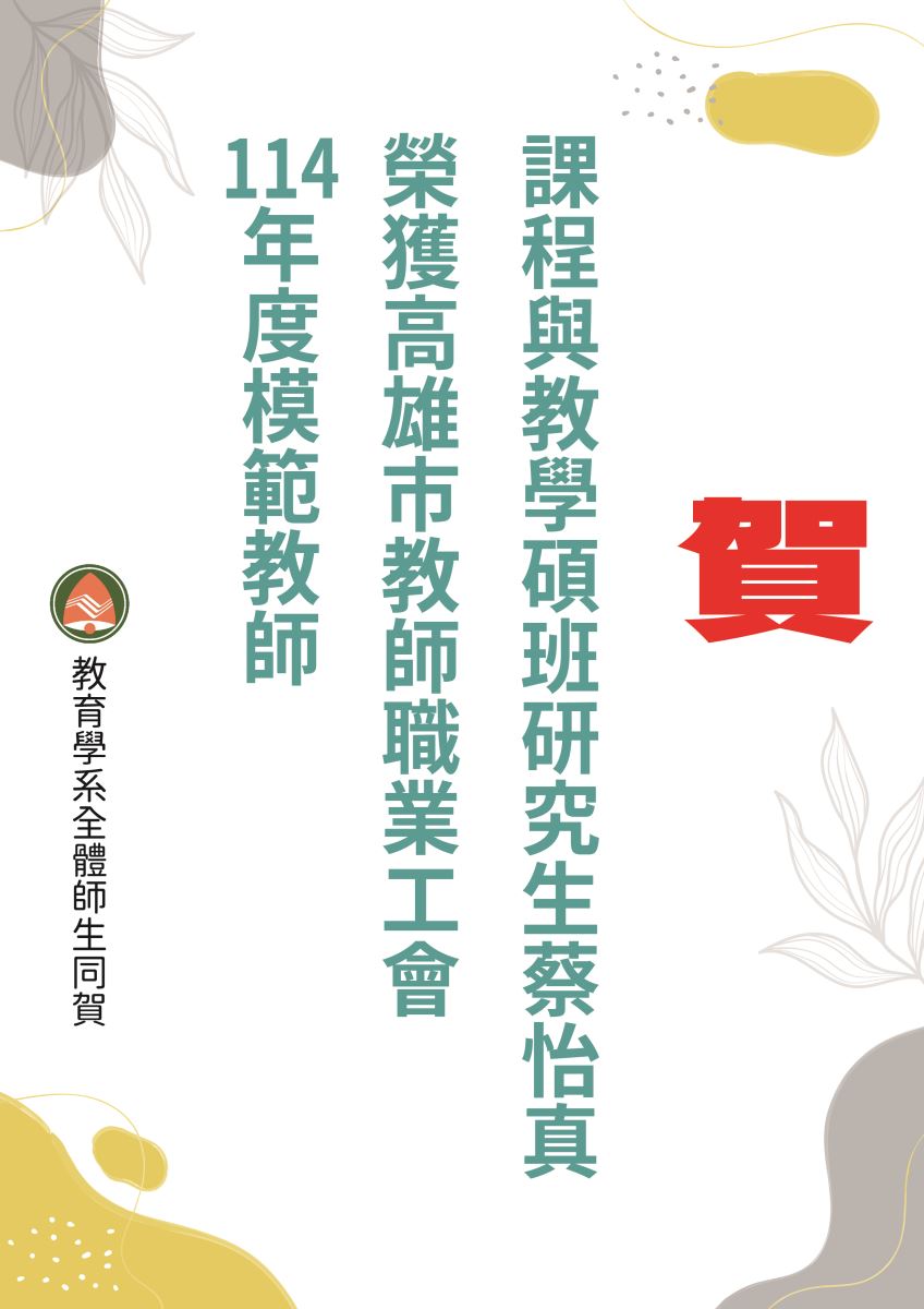 賀課程與教學碩班研究生蔡怡真榮獲高雄市教師職業工會114年度模範教師