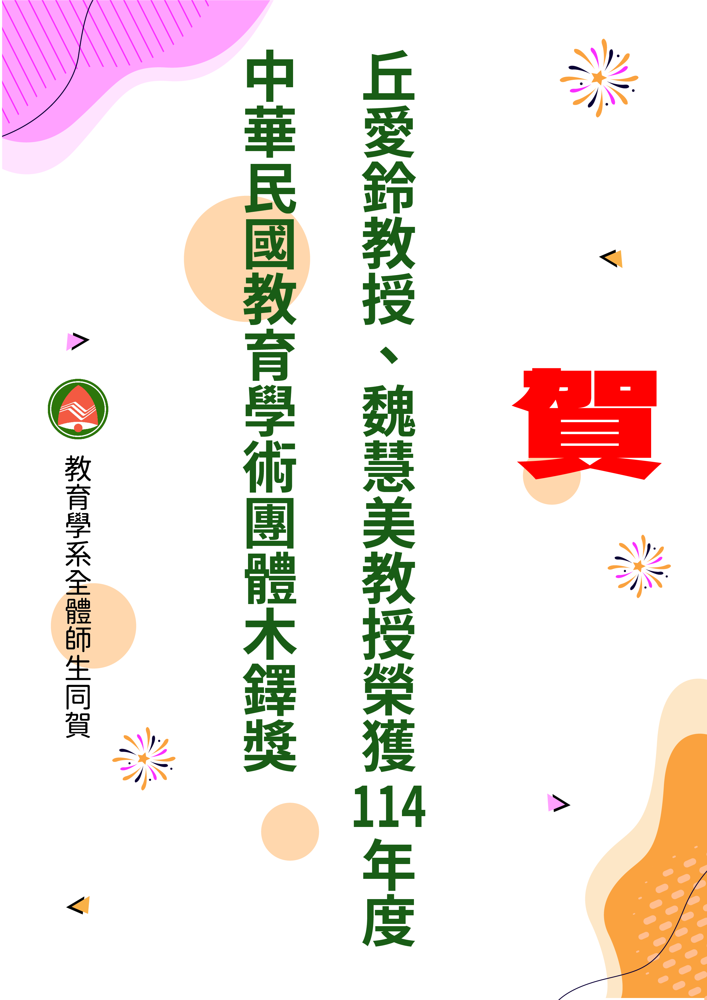 賀丘愛鈴教授、魏慧美教授榮獲114年度中華民國教育學術團體木鐸獎