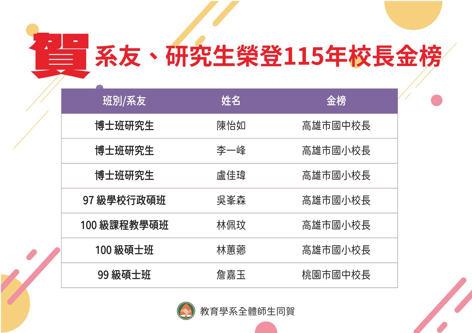 賀本系系友、博士班研究生榮登115年校長金榜