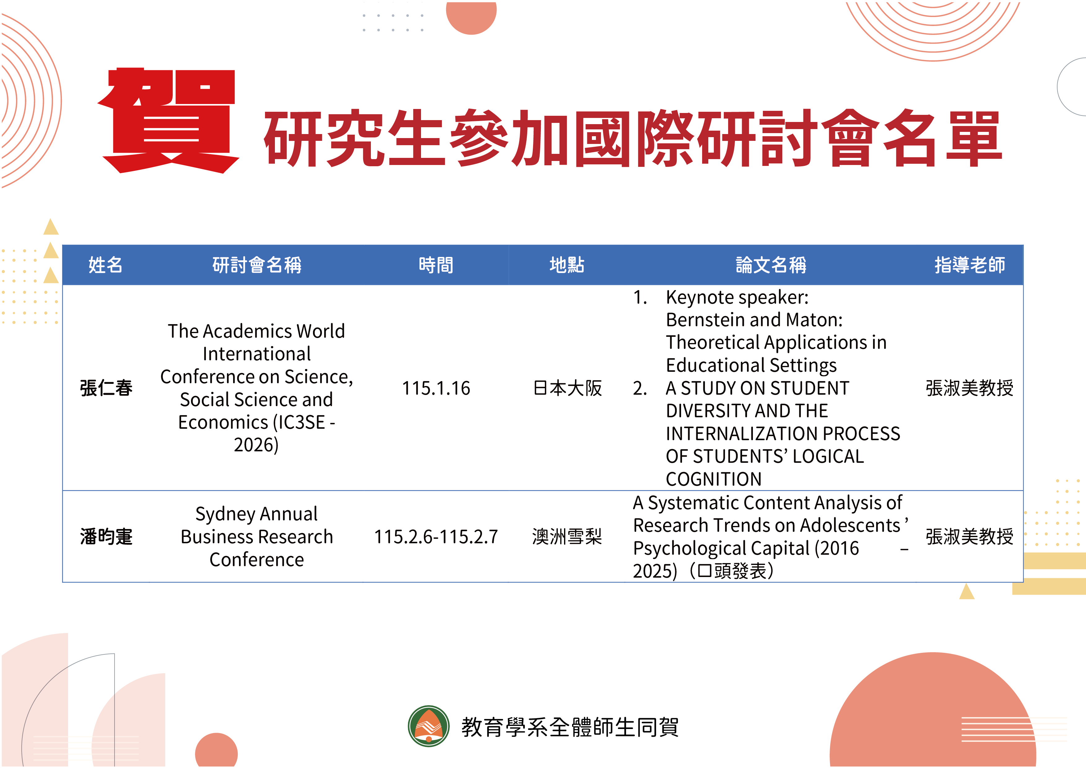 賀本系研究生參加國際研討會