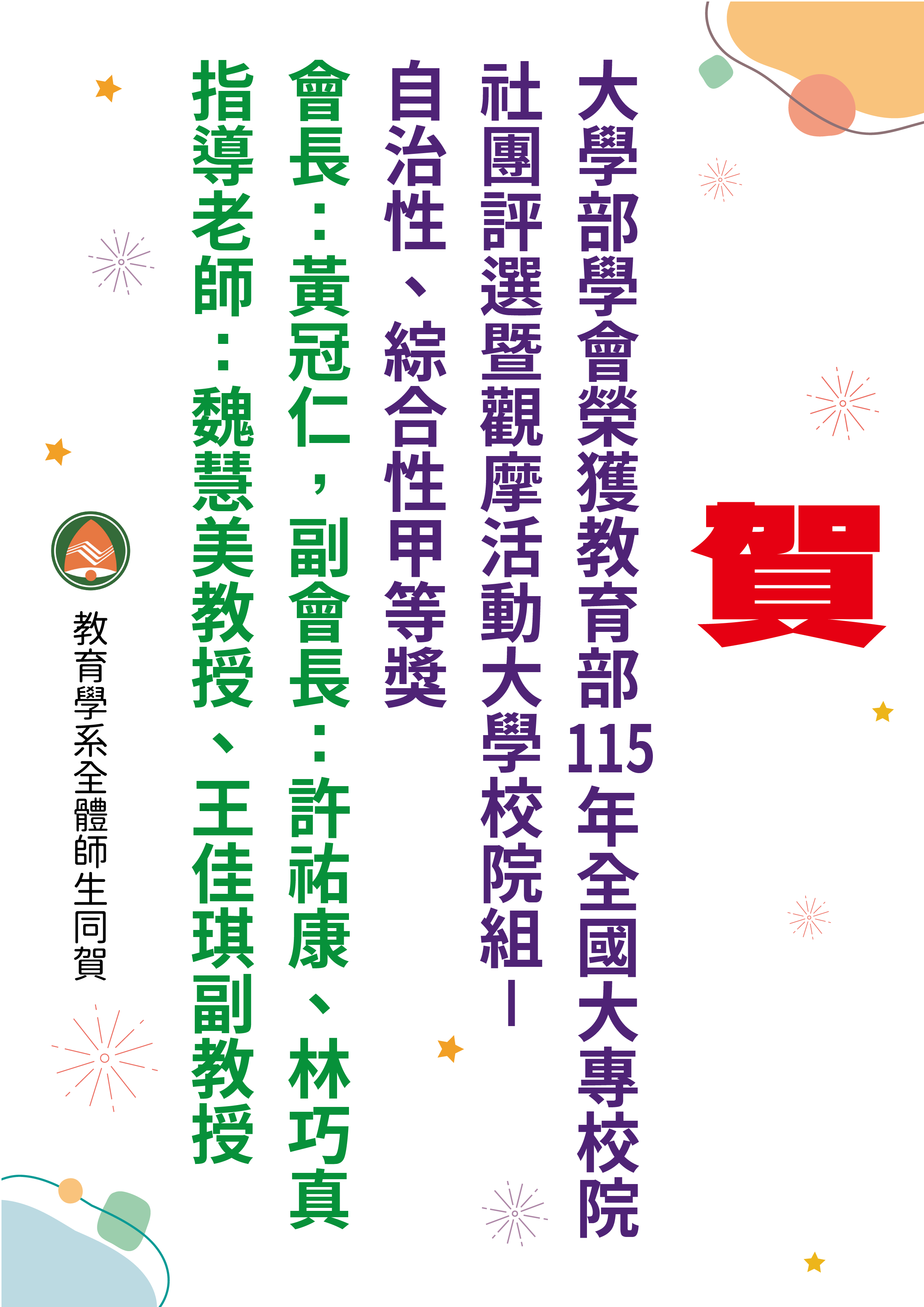 賀大學部學會榮獲教育部115年全國大專校院社團評選暨觀摩活動大學校院組甲等獎