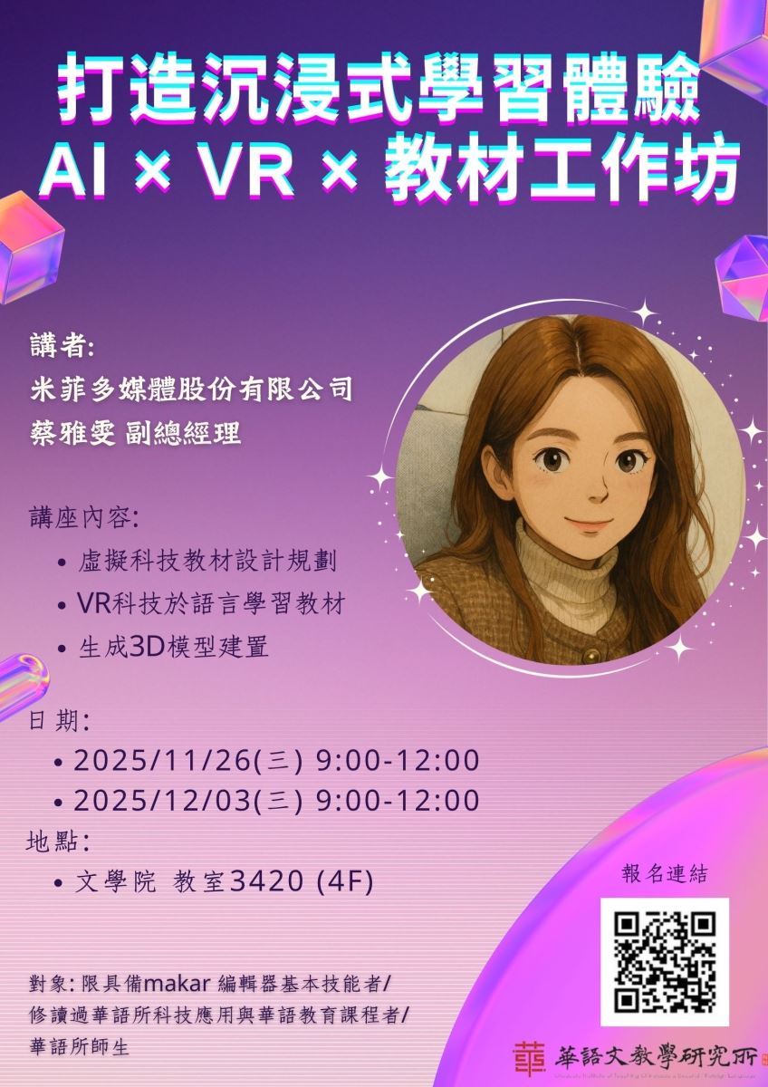2025年11月26日(三)、12月3日(三)講座分享:打造沉浸式學習體驗 AIXVR×教材工作坊