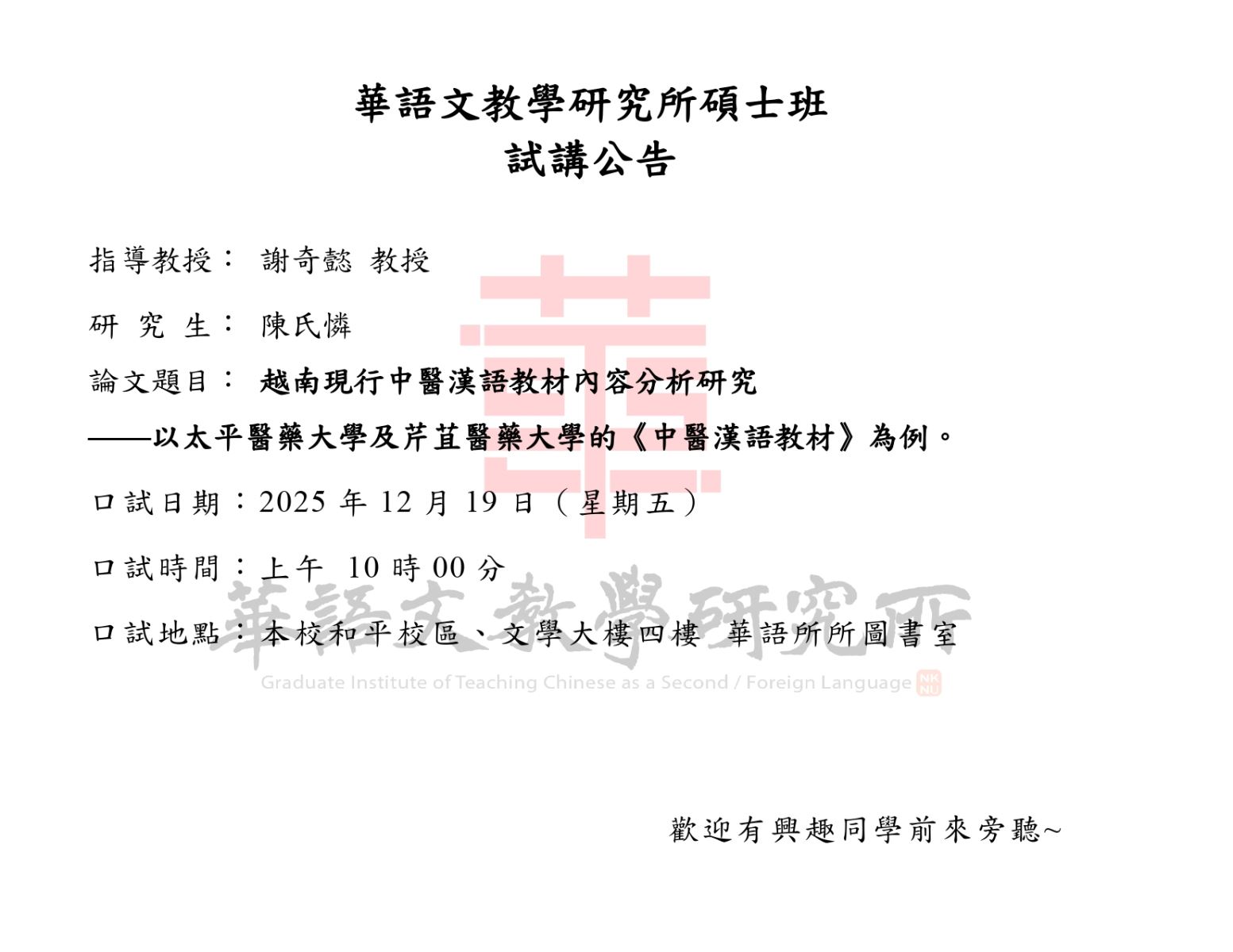 【試講】:114年12月19日(五)陳氏憐:越南現行中醫漢語教材內容分析研究 ——以太平醫藥大學及芹苴醫藥大學的《中醫漢語教材》為例