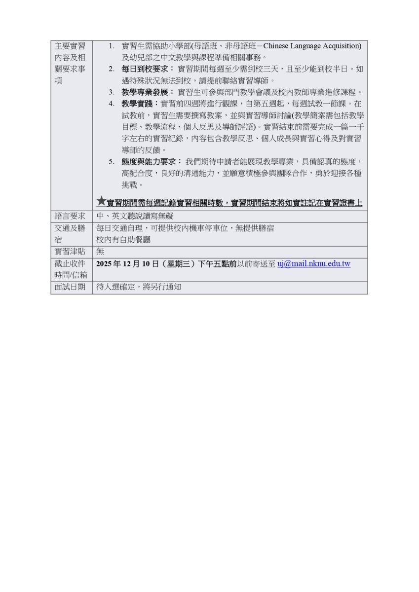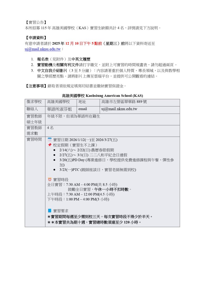 【延長收件】本所招募115年 高雄美國學校(KAS)實習生缺額共計4名,詳情請見下方說明。