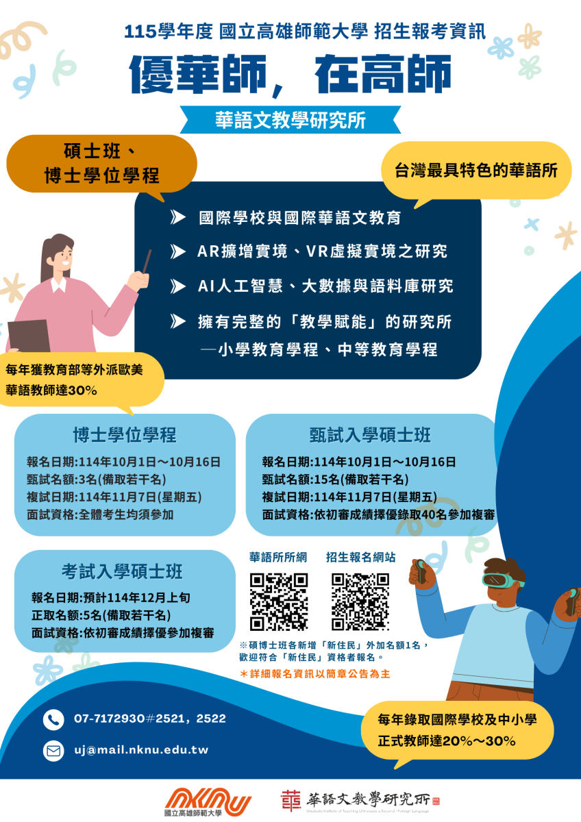 版權所有:國立高雄師範大學 華語文教學研究所 本校位置:80201 高雄市苓雅區和平一路116 號,台灣(中華民國)|地圖 Copyright © Graduate Institute of Teaching Chinese as a Second/Foreign Language, National Kaohsiung Normal University. Address : No.116, Heping 1st Rd., Lingya District, 80201 Kaohsiung, Taiwan, R.O.C. TEL : 886-7-7172930 ext. 2521/2522 FAX:886-7-7166896 E-mail:uj@mail.nknu.edu.tw