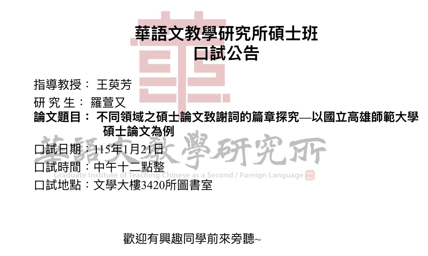 【口試】:115年1月21日(三)羅萱又:不同領域之碩士論文致謝詞的篇章探究一以國立高雄師範大學 碩士論文為例