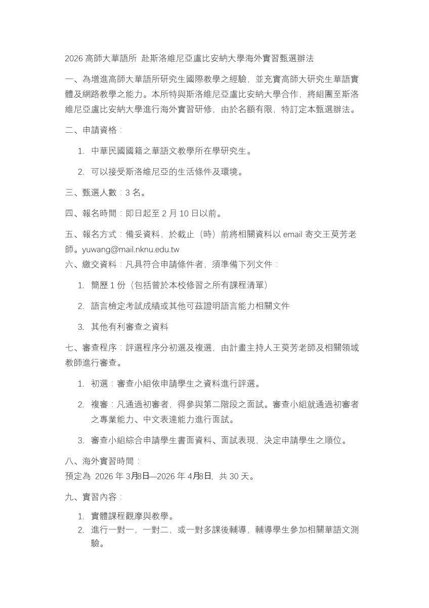 【實習公告】2026本所赴斯洛維尼亞盧比安納大學海外實習甄選辦法