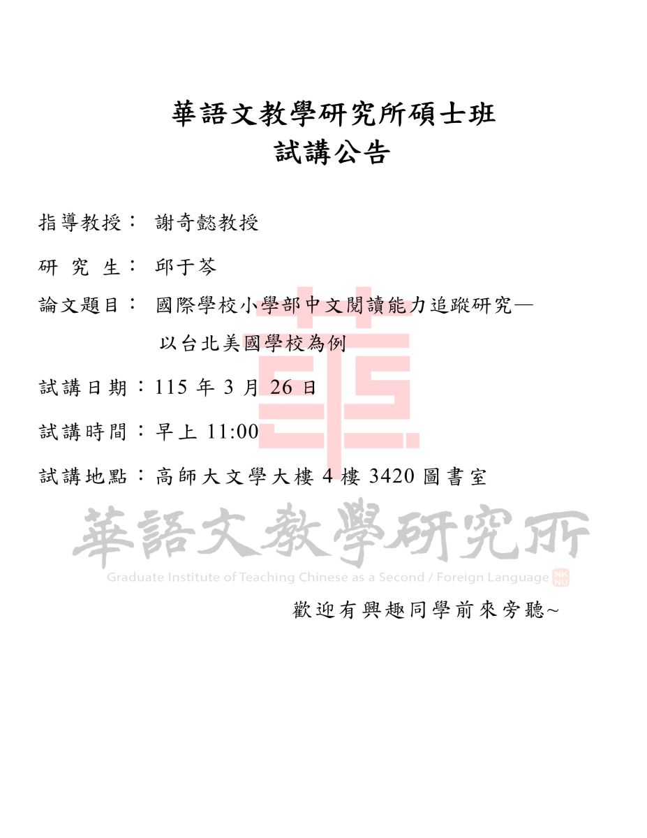 【試講】:115年3月26日 (四) 邱于芩:國際學校小學部中文閱讀能力追蹤研究— 以台北美國學校為例