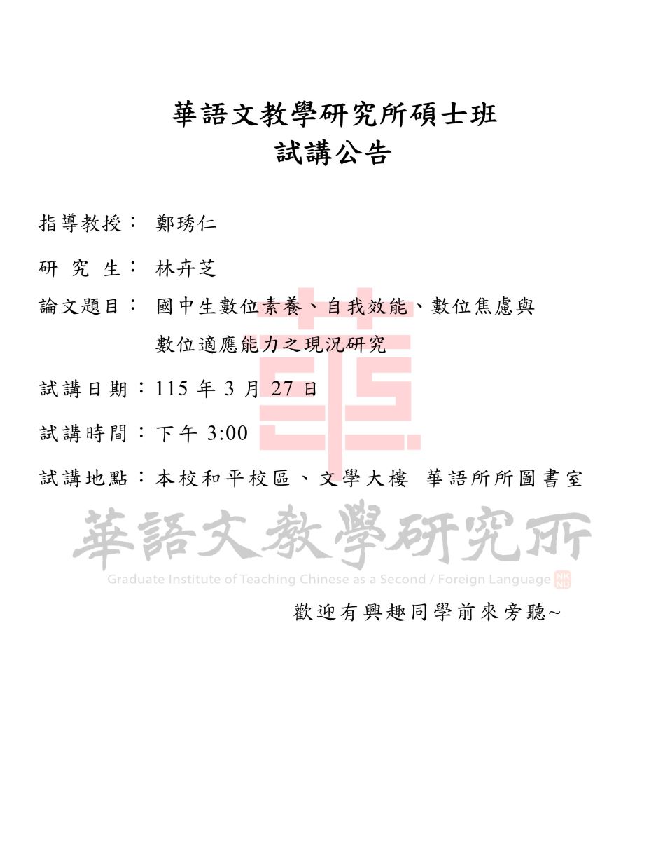 【試講】:115年3月27日 (星期五) 林卉芝:國中生數位素養、自我效能、數位焦慮與數位適應能力之現況研究