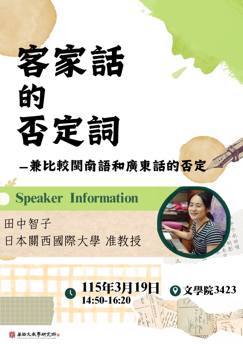 2026年3月19日(四)講座分享:「客家話的否定詞 —兼比較閩南語和廣東話的否定」