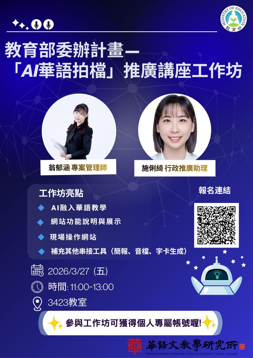 2026年3月27日(五) 工作坊:教育部委辦計畫- 「AI華語拍檔」推廣講座工作坊