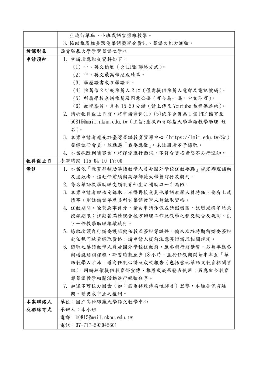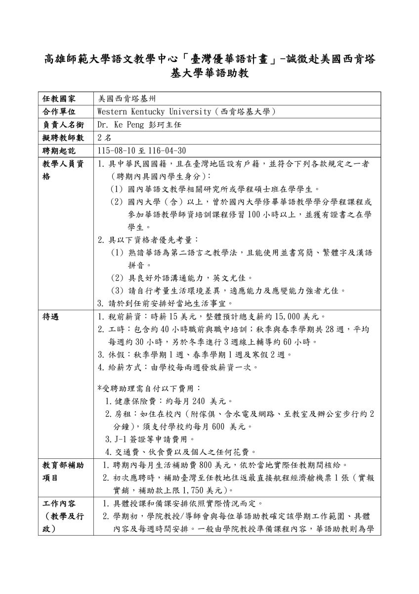 【美國西肯塔基大學 】高雄師範大學語文教學中心「臺灣優華語計畫」-誠徵赴美國西肯塔基大學華語助教