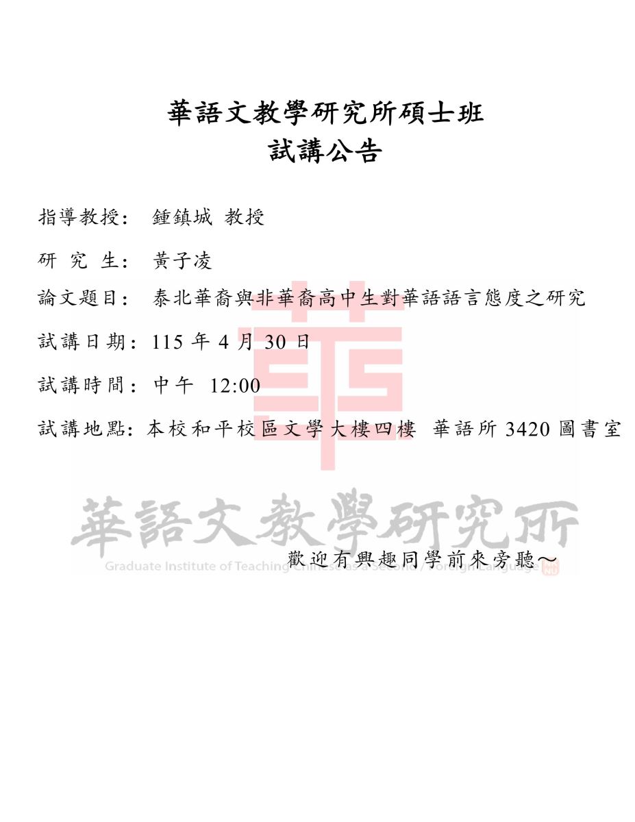 【試講】:115年4月30日(星期四) 黃子凌:泰北華裔與非華裔高中生對華語語言態度之研究