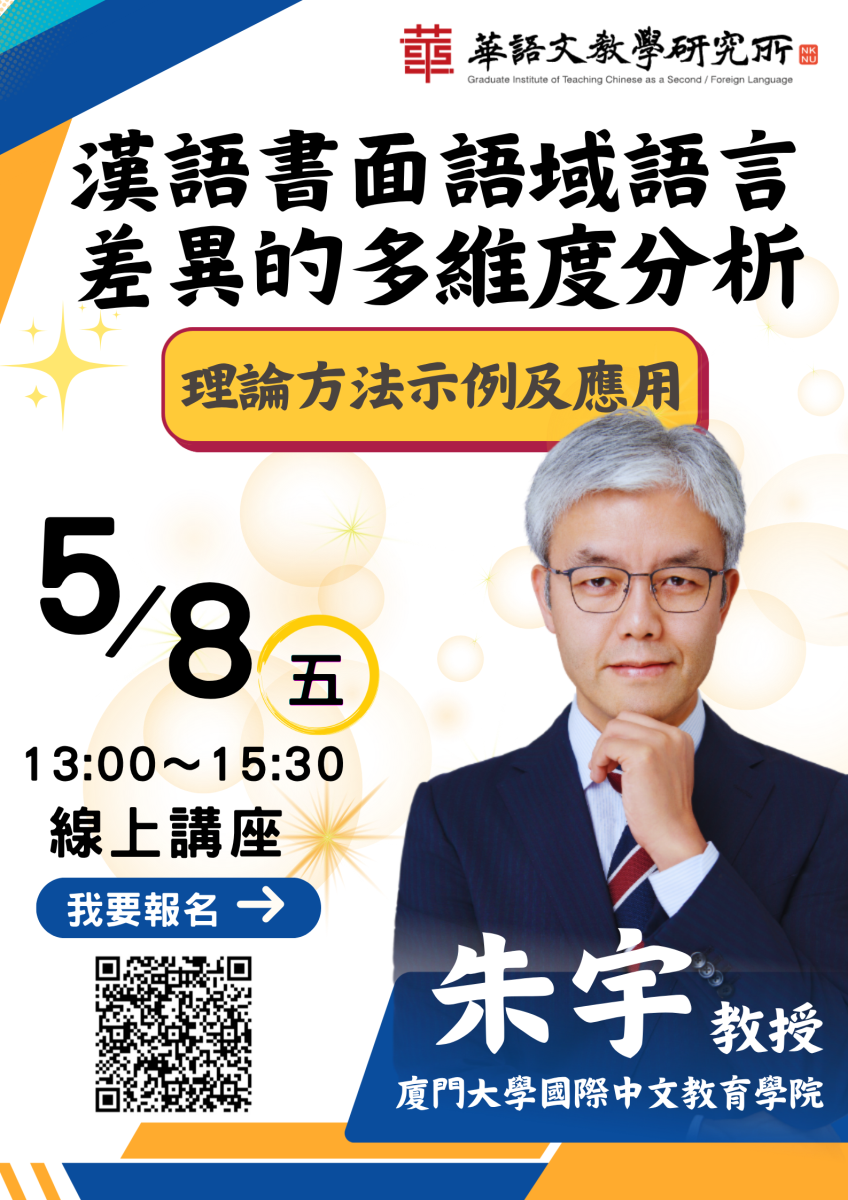 2026年5月8日(五)講座分享:「漢語書面語域語言差異的多維度分析--理論方法示例及應用」