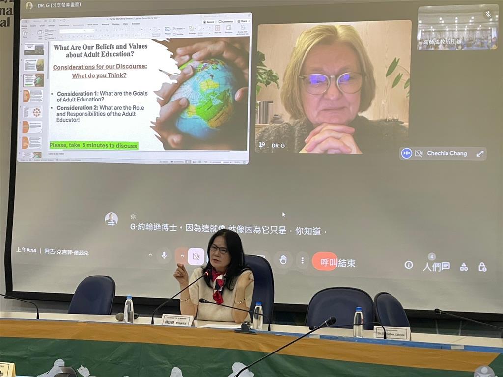 令與會者滿載收穫的跨國視訊專題演講,率先由美國德保羅大學(DePaul University)講座教授Dr. Strohschen Gabriele主講「邁向人類精神的自由:從解放教育的角度看現實與可能」,Dr. Strohschen以解放教育理論(Emancipatory Education Theory),啟發與會者運用互動式對話,進行一場自我覺知的思辨之旅,使得本次研討會,成為實踐解放教育理論的學術載體,讓與會者藉由梳理自我從個人出發,直面思考所面對之挑戰及達成社會變革的可能路徑。現場運用AI即時翻譯科技,跨越語言與文化之限制,促進國際學者與與會者的跨文化對話與反思;第二場演講由國立中山大學教育研究所邱文彬教授接棒分享「高齡少子社會的成人教育」,聚焦高齡化及少子化現況研討。