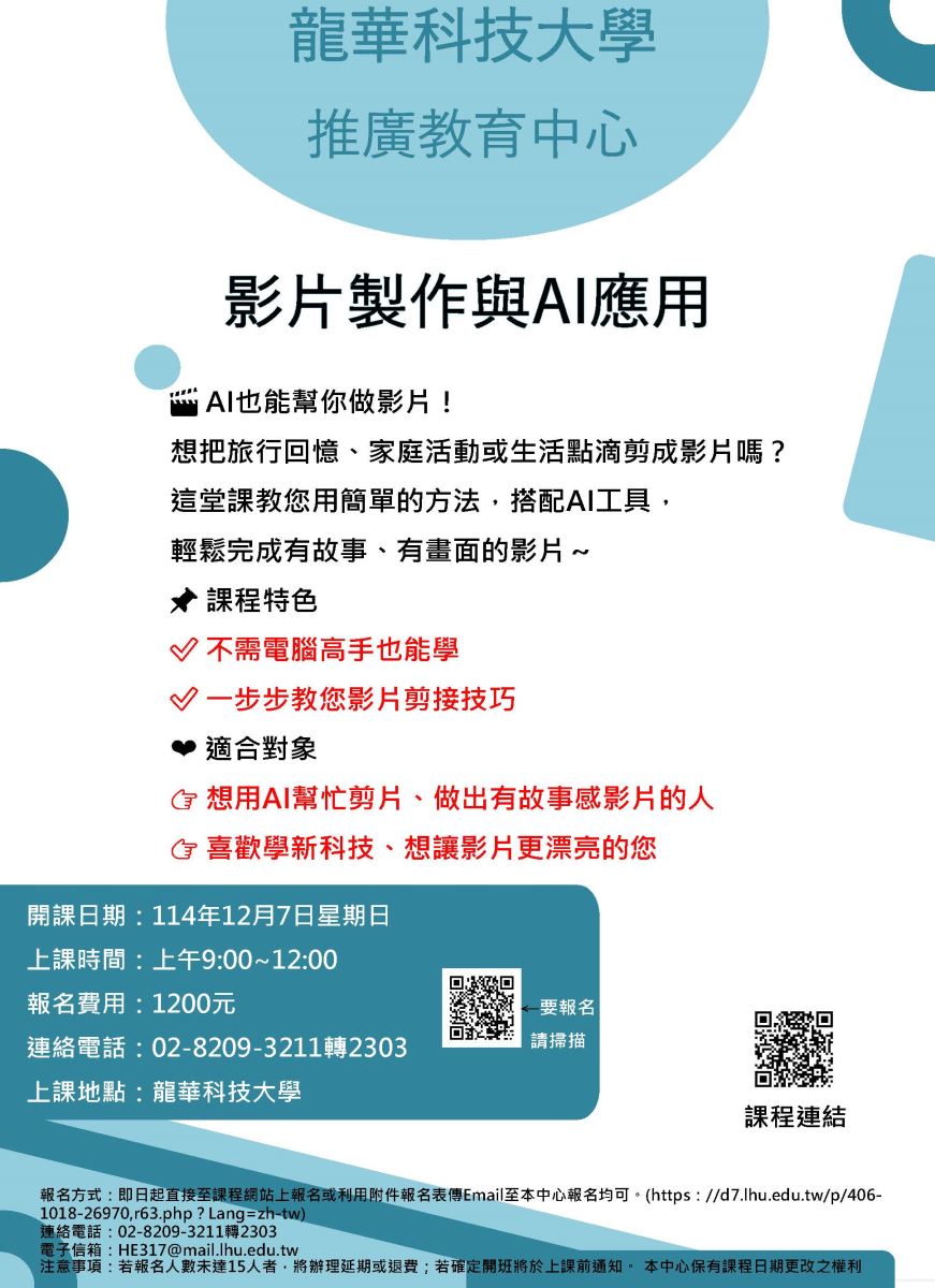 本校推廣教育中心特開設「樂齡AI新體驗—影片製作與AI應用」課程。