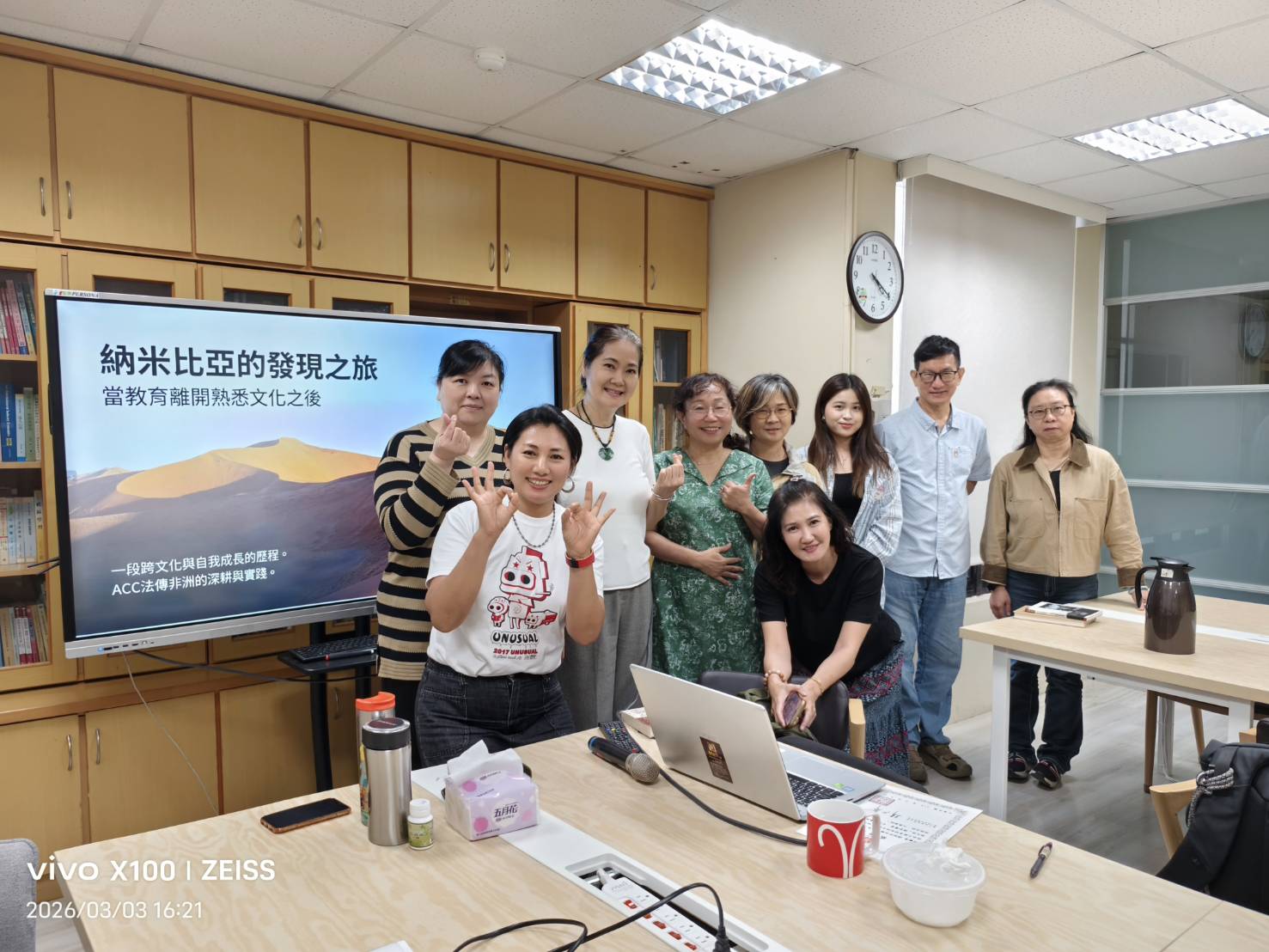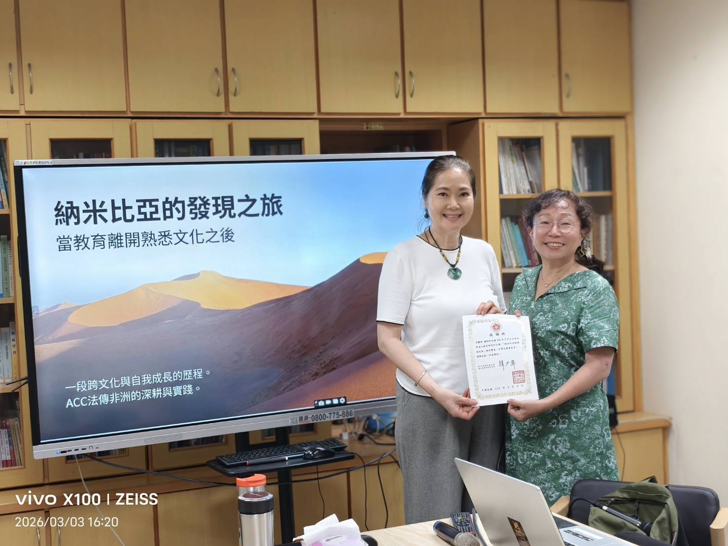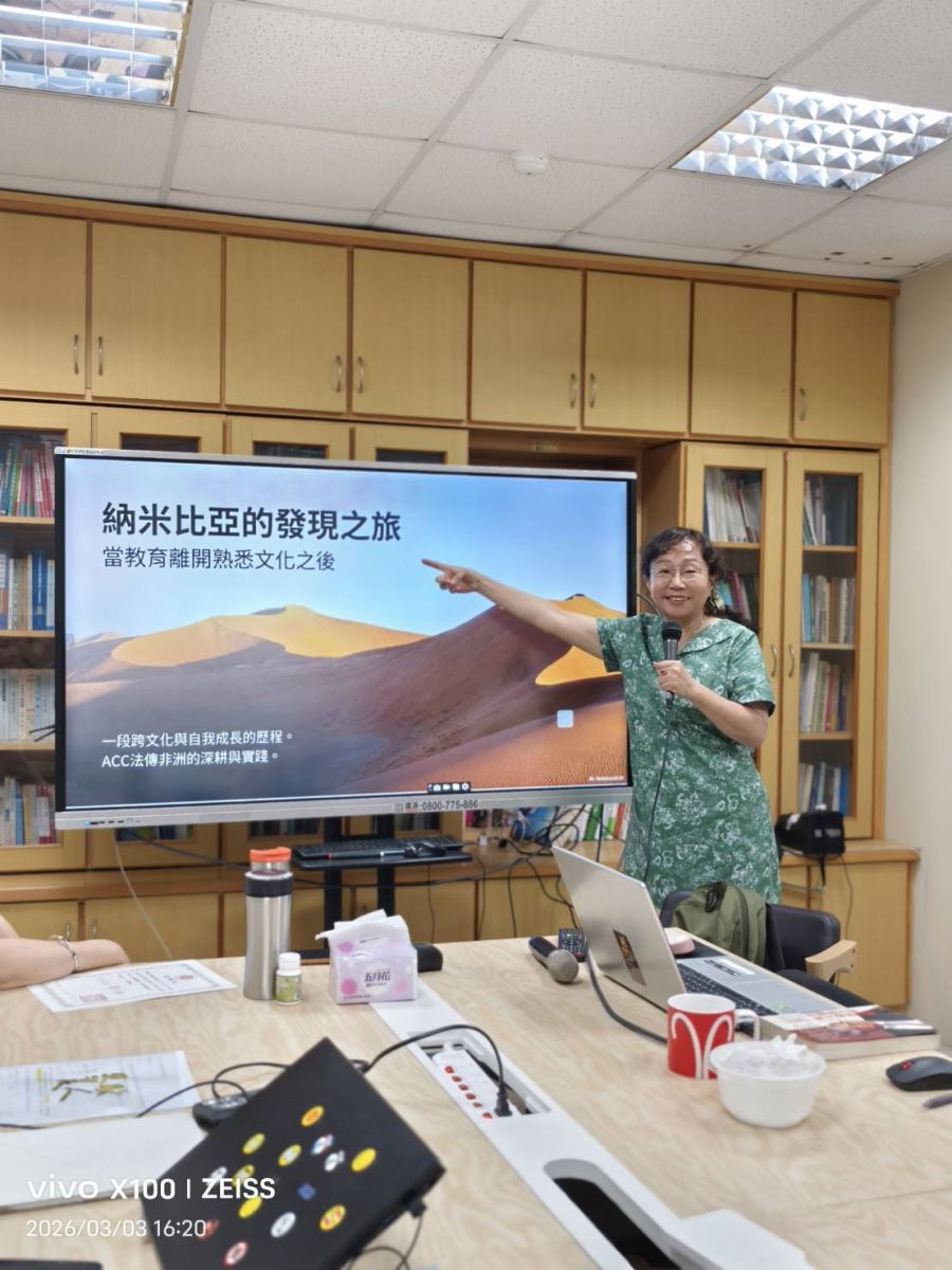 本所於115年3月3日,邀請阿德勒心理學會生命設計教練、德國工商婦女會創業顧問呂艷華,分享「納米比亞發現之旅」,透過這次分享讓學生體會到學習其實不只存在於課堂,而是貫穿人生不同階段的歷程,這正是成人教育所強調的「終身學習」精神。