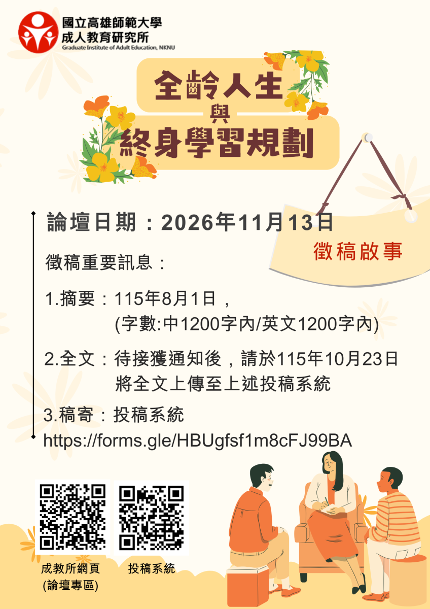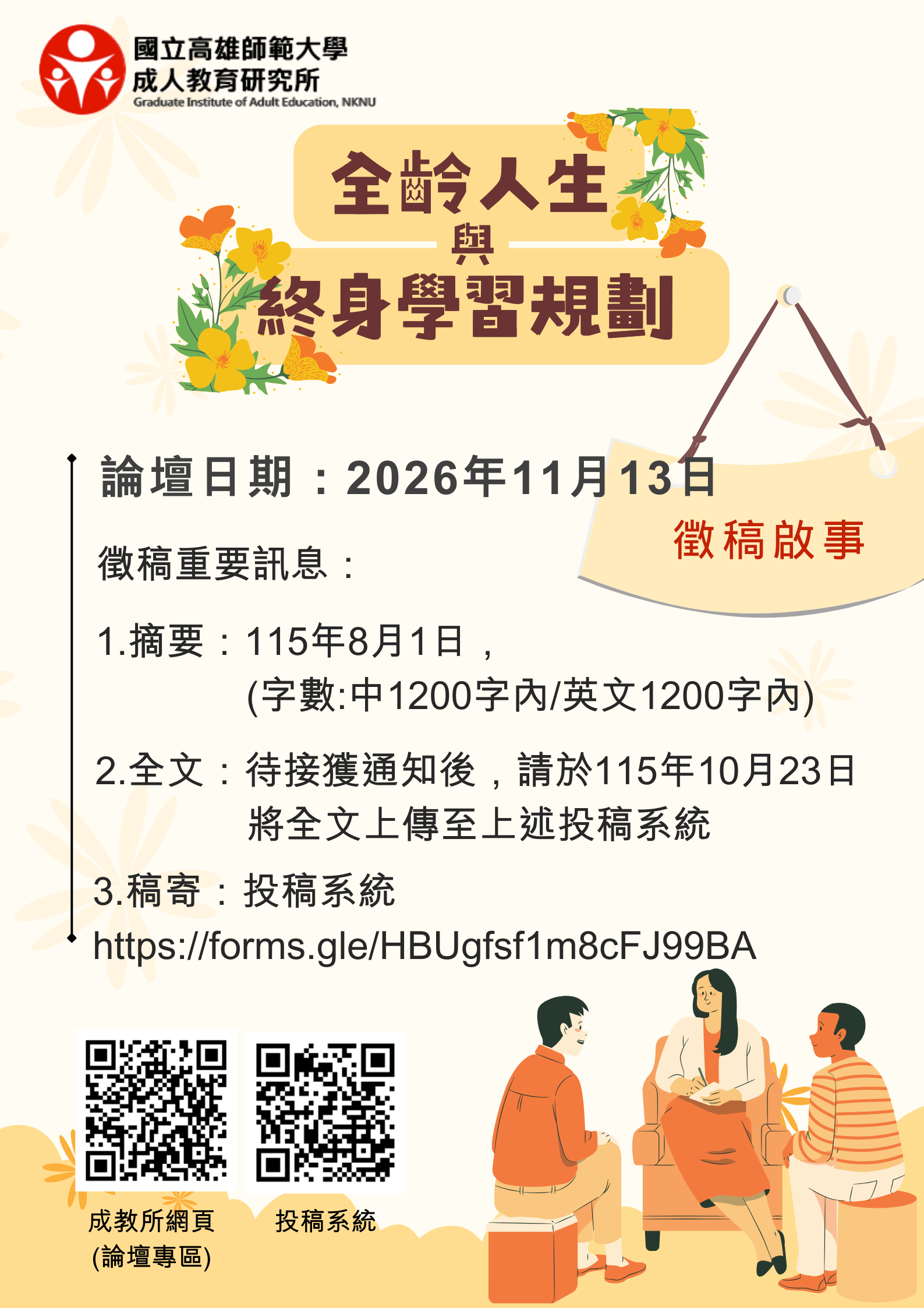 高師大成人教育研究所「 2026全齡人生與終身學習規劃」學術研討會徵稿開始囉!!