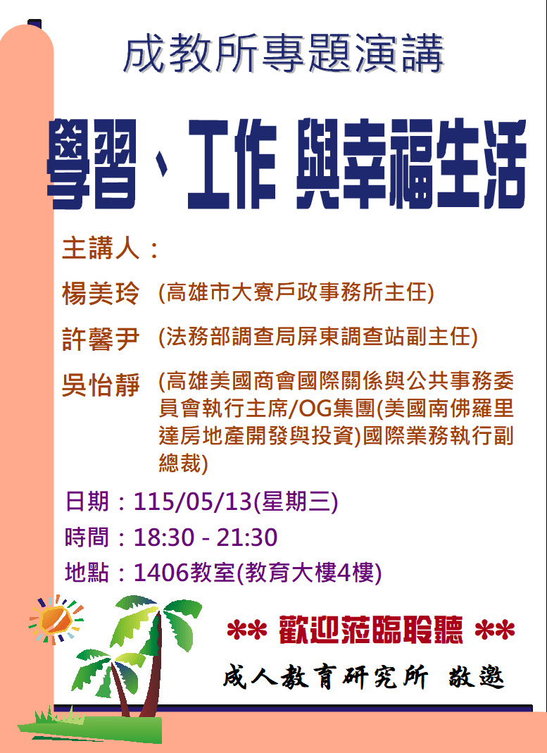 1150513專題演講-學習、工作 與幸福生活 , 歡迎聆聽~