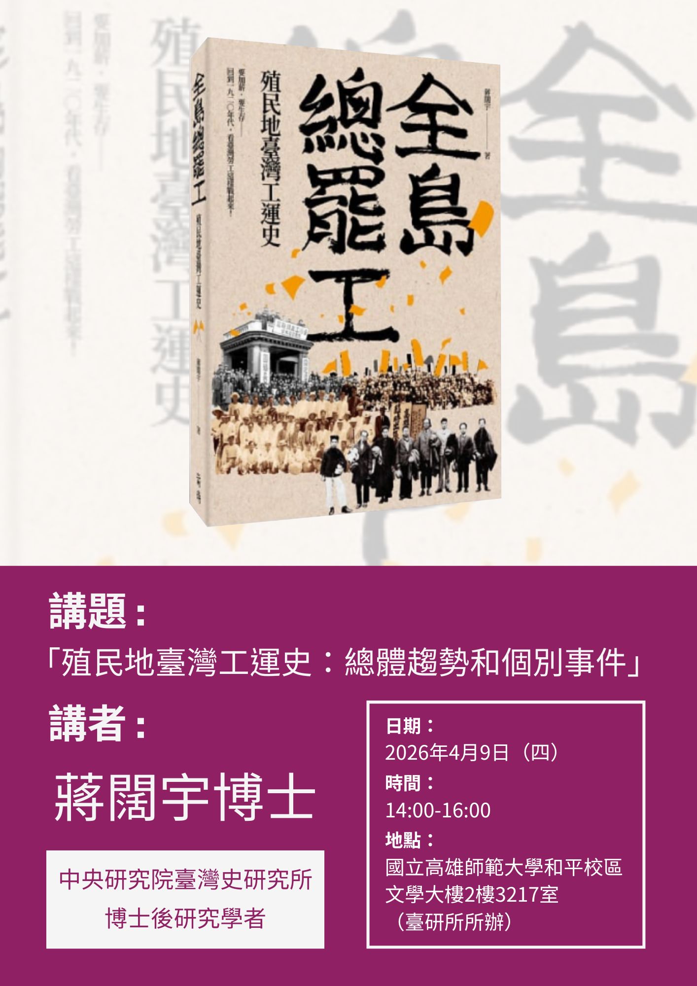 【學術專題演講】4/9蔣闊宇博士蒞臨演講