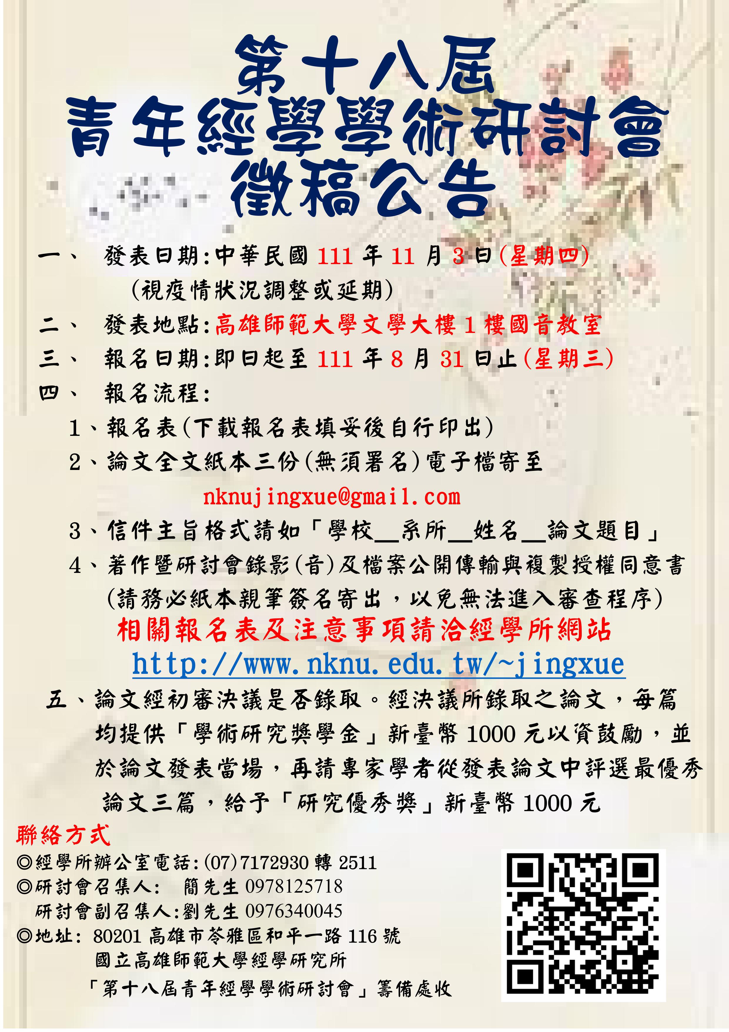本所謹訂於中華民國111年11月3日(星期四)(視疫情狀況調整或延期)舉辦第十八屆「青年經學學術研討會」,冀望群賢畢至,少長咸集,相觀而善,凝新氣象。