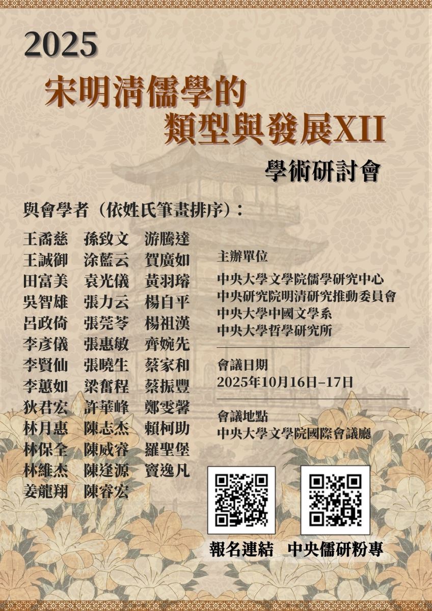 主辦單位:中央大學文學院儒學研究中心、中央研究院明清研究推動委員會、中央大學中國文學系、中央大學哲學研究所