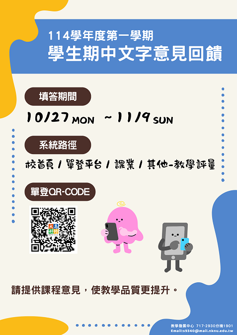 114-1【學生期中文字意見回饋】,歡迎同學踴躍填答。