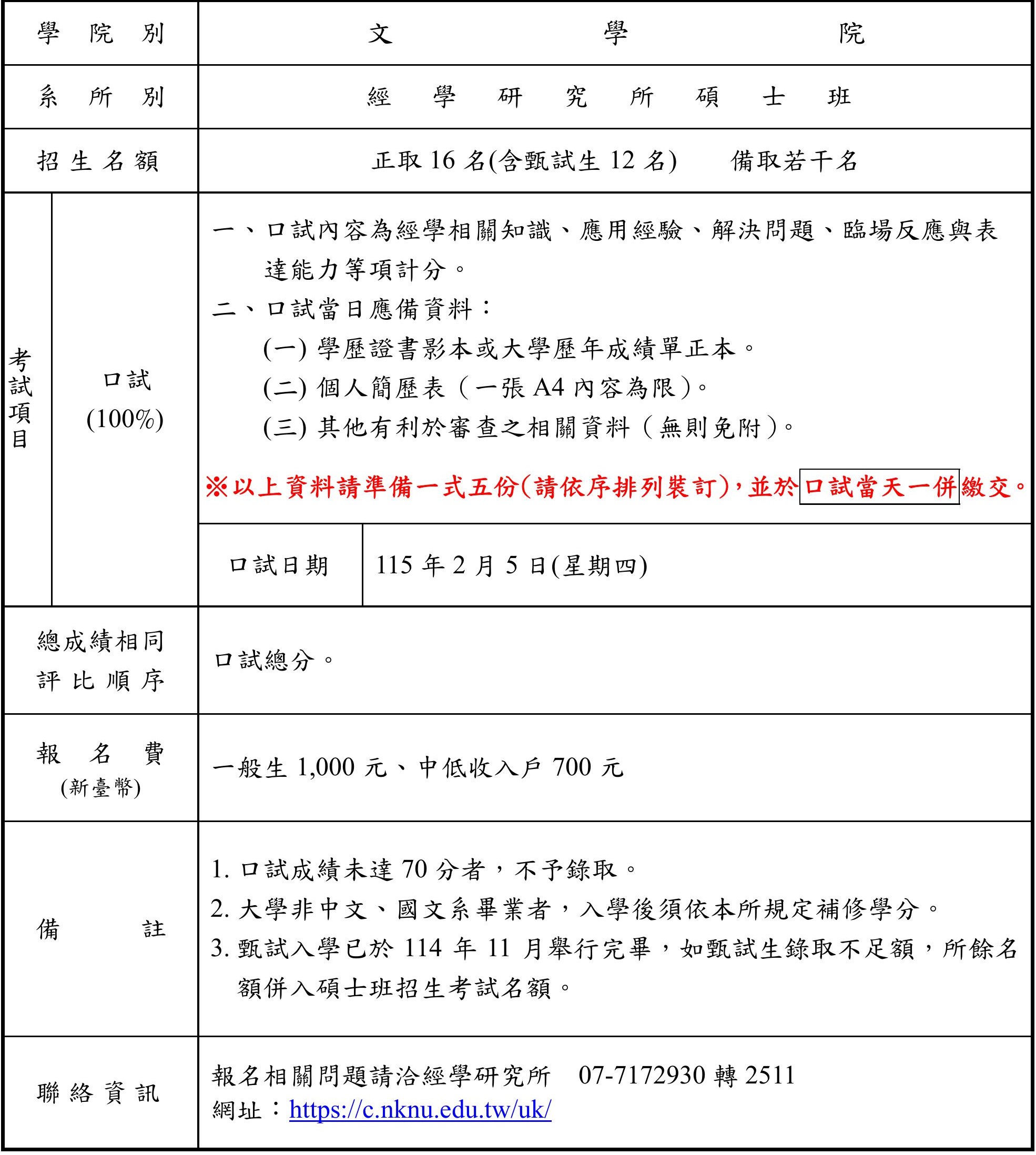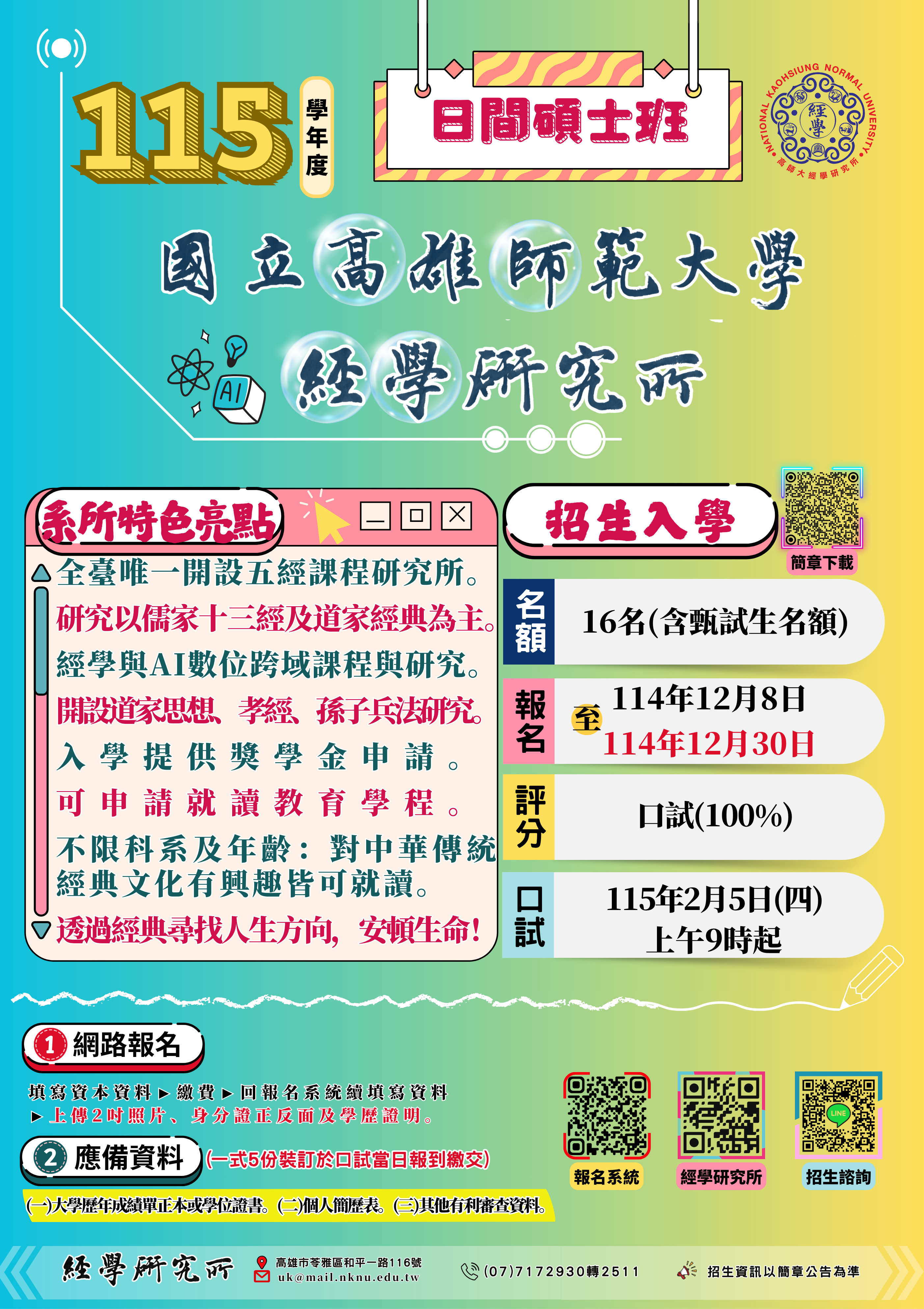 國立高雄師範大學經學研究所115學年度日間部招生入學公告