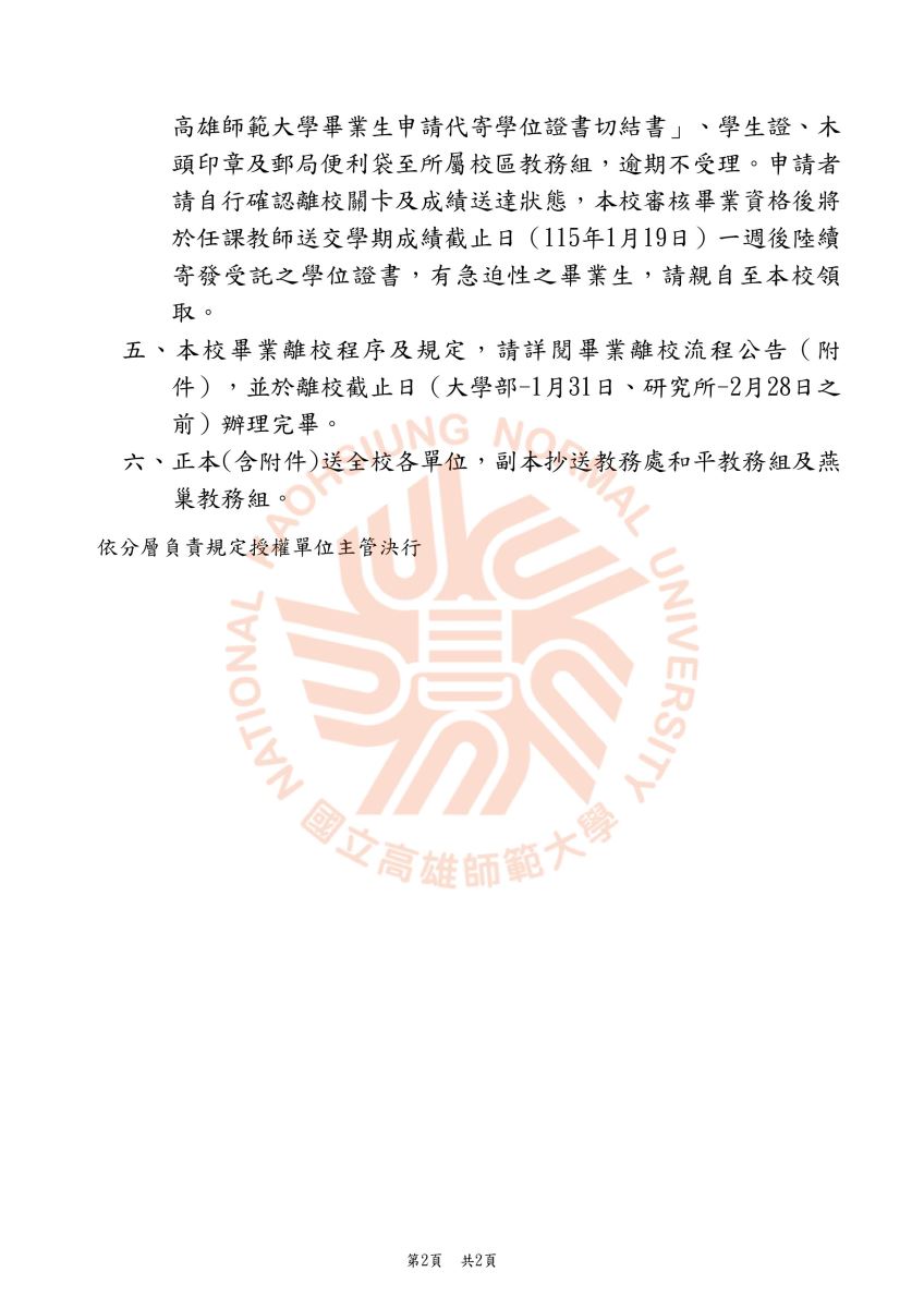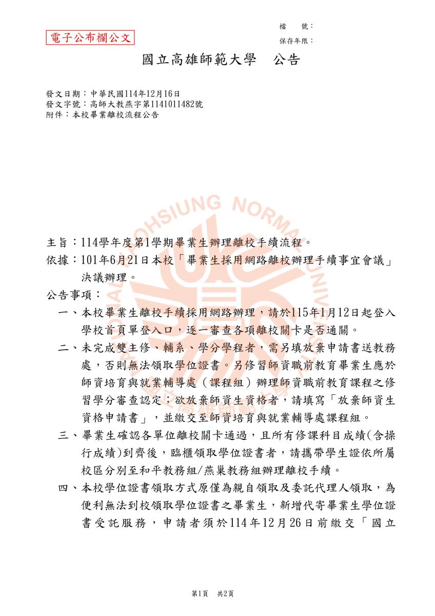 公告本校114學年度第1學期畢業生辦理離校手續流程