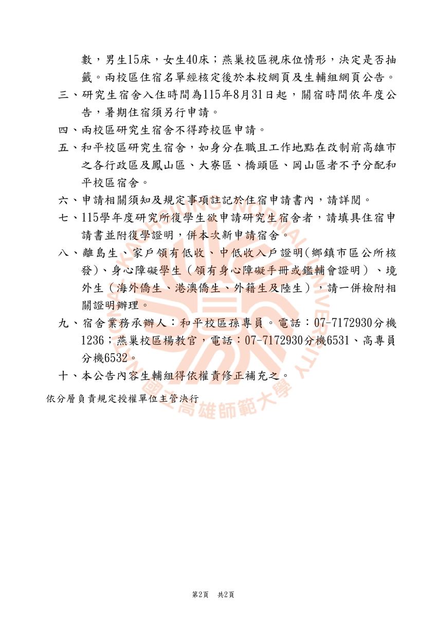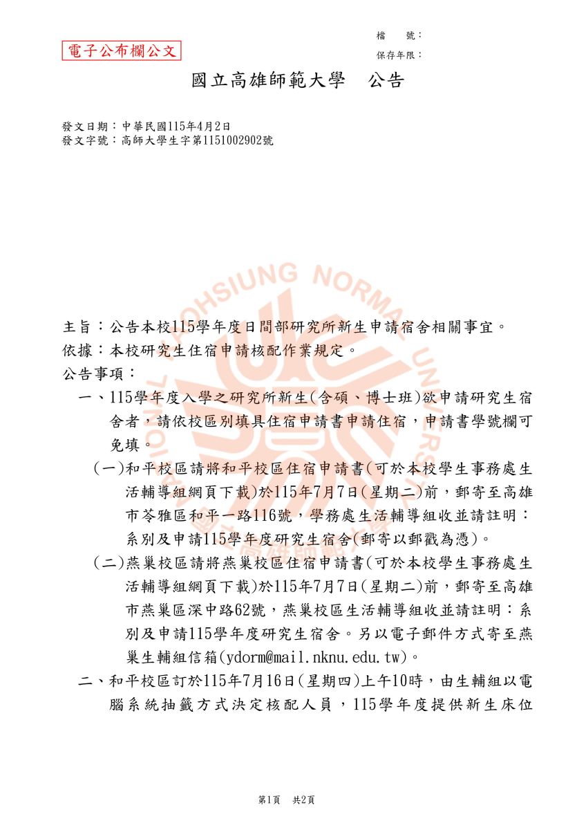 公告本校115學年度日間部研究所新生申請宿舍相關事宜