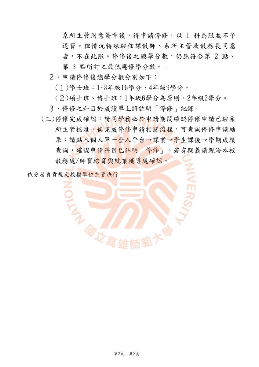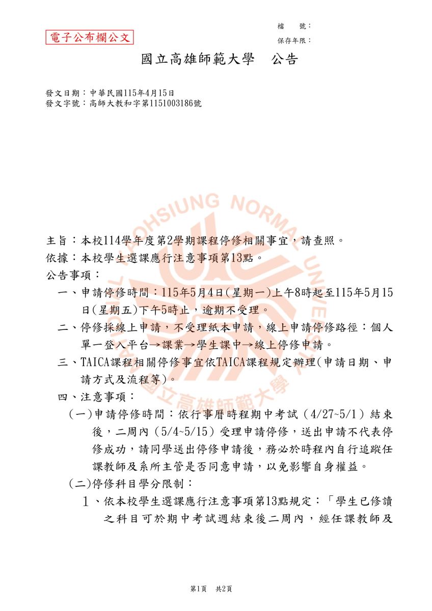 【公告】本校114學年度第2學期線上申請停修期間為5/4~5/15,逾期不受理。