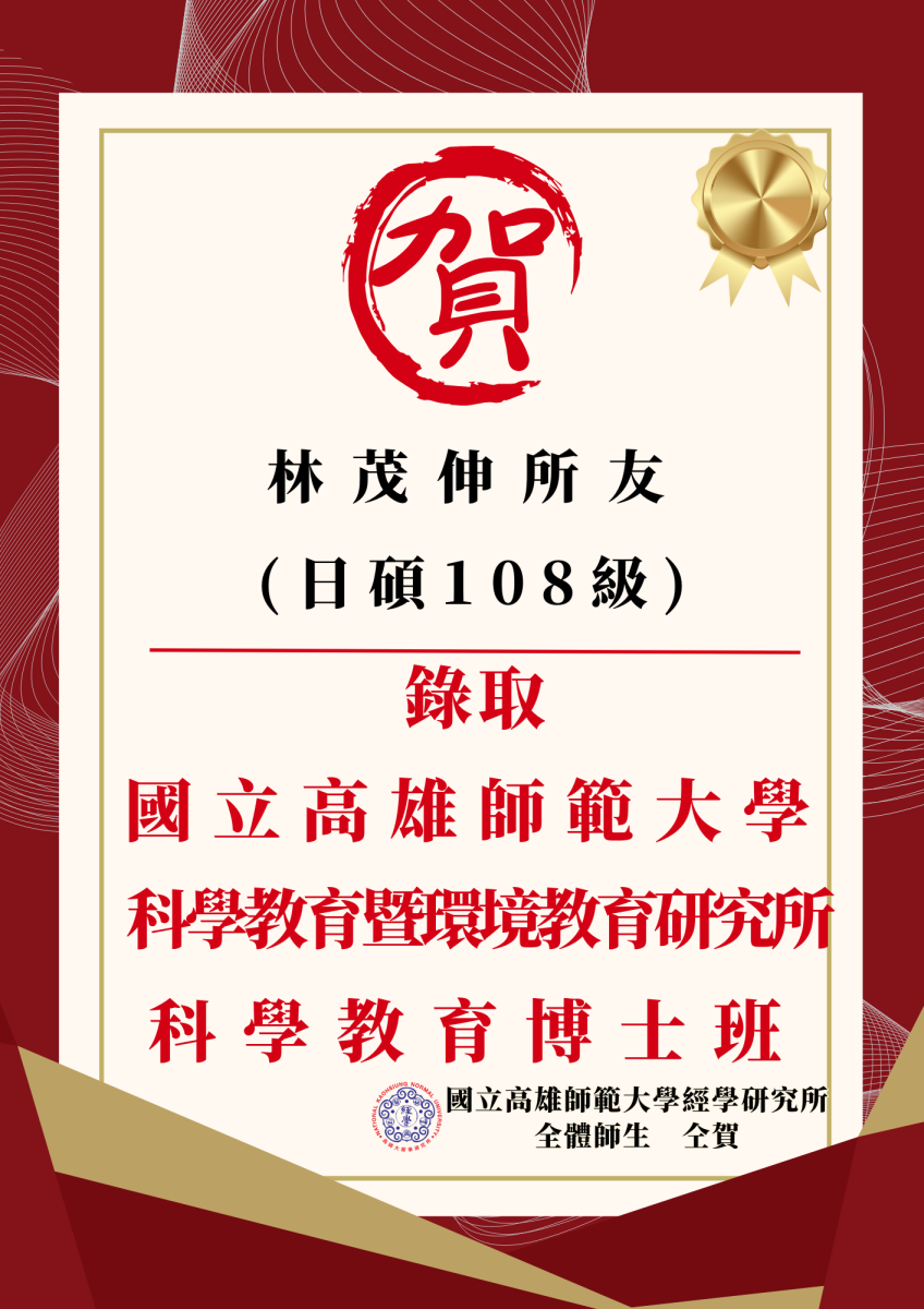 賀!本所日間108級林茂伸所友錄取本校科學教育暨環境教育研究所科學教育博士班